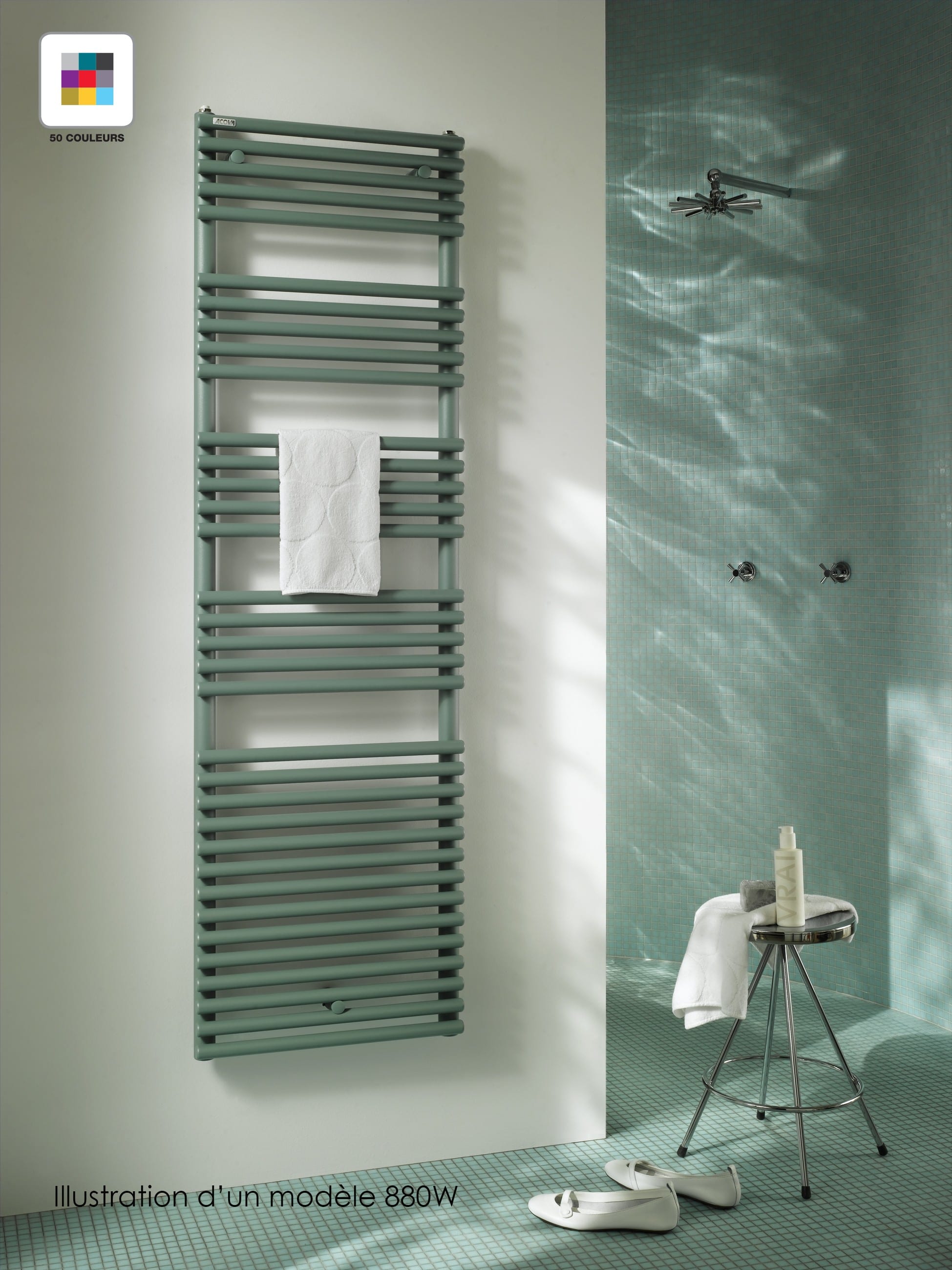 Radiateur sèche-serviettes en acier à tubes ronds, posés sur les collecteurs. Il est adapté à de nombreuses configurations (par exemple, modèles faible largeur ou pose en claustra). Se décline en blanc, en finition chromée, dans les 46 couleurs du nuancier Acova. Disponible en version électrique (avec ou sans soufflant), chauffage central (avec ou sans soufflant) ou mixte.