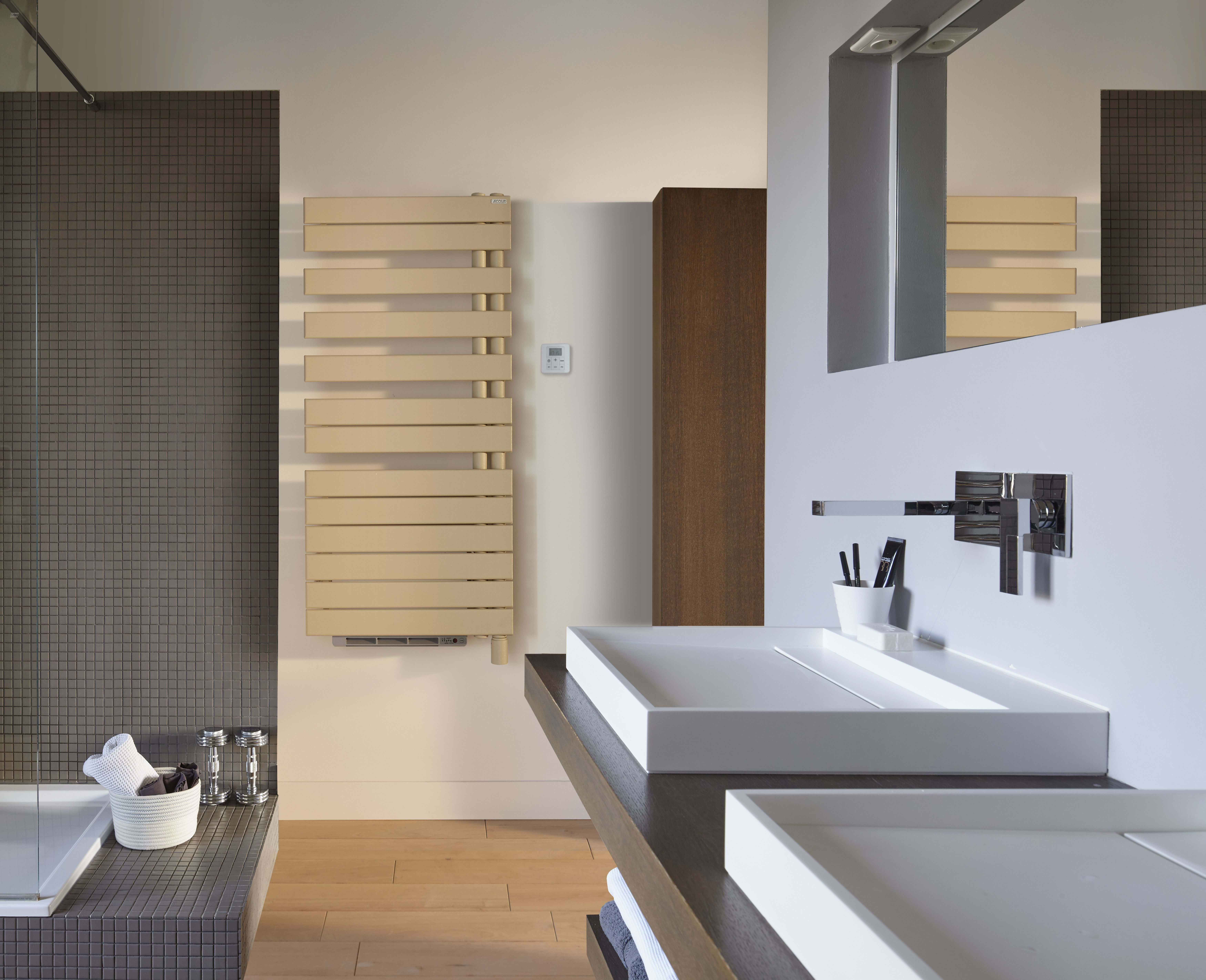 Radiateur sèche-serviettes en acier à tubes plats. Son design asymétrique (à gauche ou à droite) est à la fois original et pratique pour poser les serviettes. Se décline en blanc, dans les 46 couleurs du nuancier Acova. Disponible en version électrique ou chauffage central.