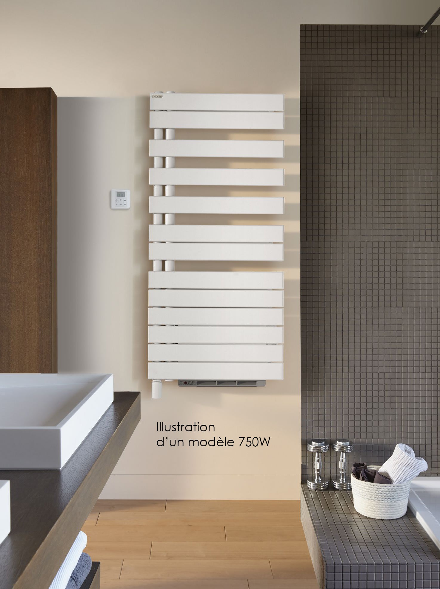 Radiateur sèche-serviettes ACOVA Fassane Spa Asymétrique Electrique +Air, collecteur à gauche, commande infrarouge IRS + soufflant 1000W, puissance 500W, hauteur 870mm, largeur 550mm, Blanc RAL 9016