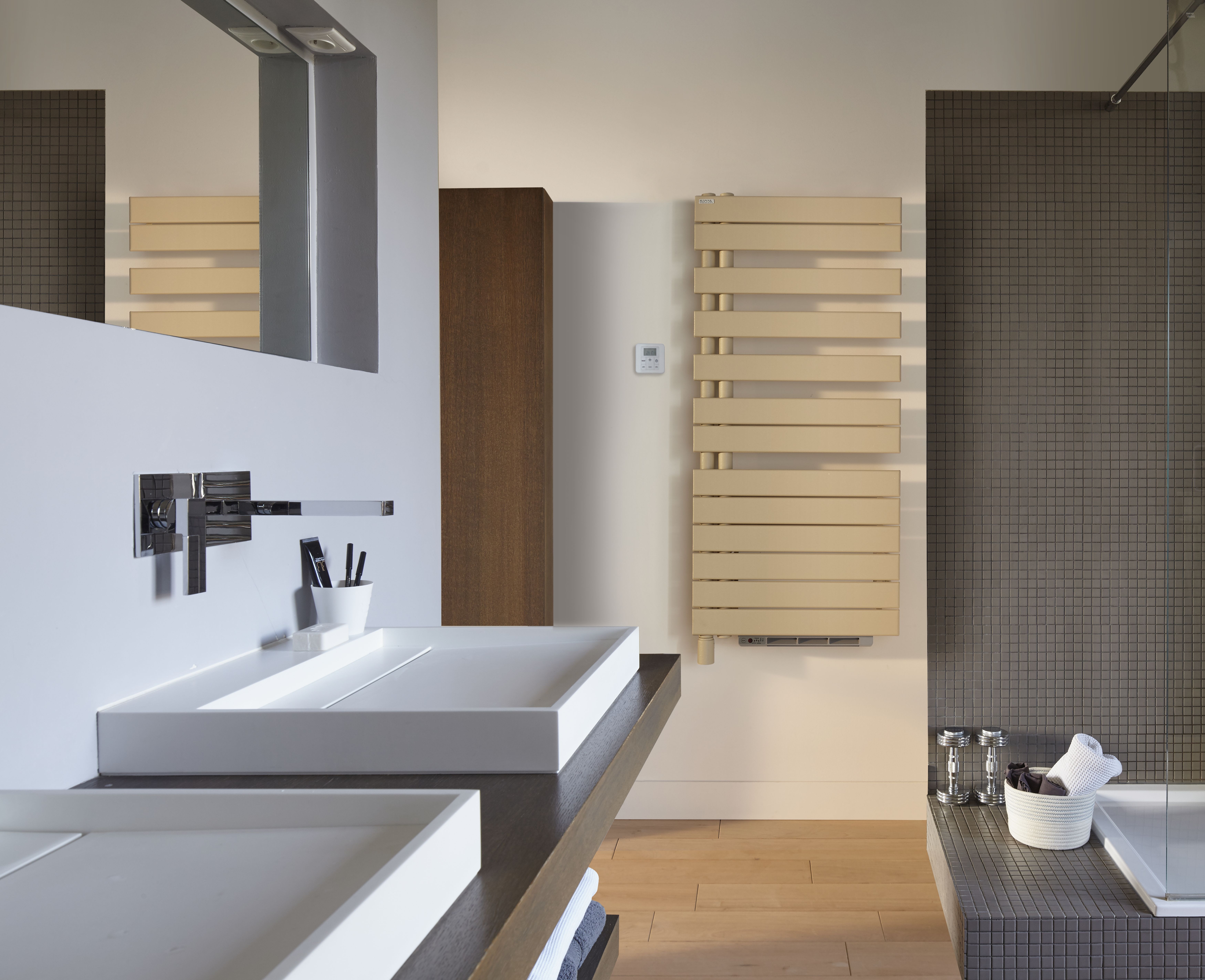 Radiateur sèche-serviettes en acier à tubes plats. Son design asymétrique (à gauche ou à droite) est à la fois original et pratique pour poser les serviettes. Se décline en blanc, dans les 46 couleurs du nuancier Acova. Disponible en version électrique ou chauffage central.
