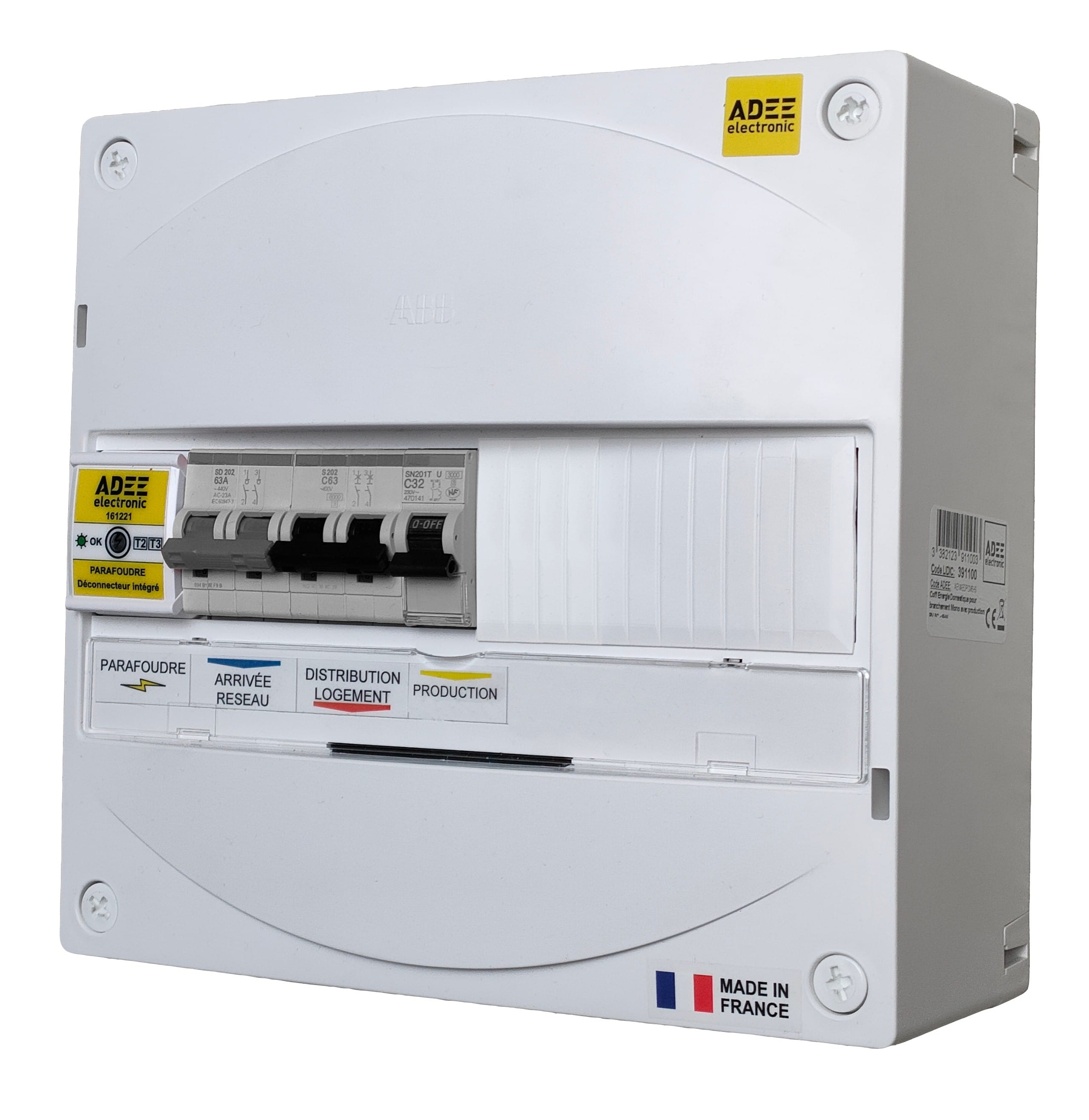 Coffret énergie Domestique pour un branchement Mono<12kW avec production PV, arrivée sur sectionneur 2P 63A, Départ vers répartition logement sur disjoncteur 2P 63A, Parafoudre et arrivée coffret AC<6kW sur disjoncteur Ph+N 32A, IP30