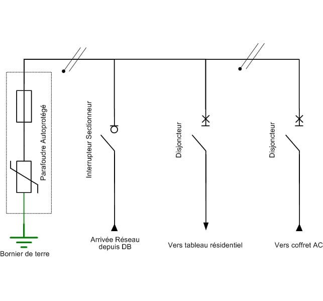 Dimensions (LxHxP mm) : 250x 250 x 120Type de branchement : MonophaséCoffret de connexion branchement à installer en amont du tableau de répartition pour conformité à NFC15-100-1 §551.7.2Puissance de Branchement 12kW Mono arrivée sur Sectionneur 2P63ACourant d’emploi (Ie) : 63A (Disjoncteur 63A courbe C) pour alimentation logementDépart vers coffret production AC <6kW sur disjoncteur Ph+N C32ARépartiteur 100ATension de service : 240Vac.Tension de protection parafoudre Up : 1.5kV ;Courant nominal de décharge parafoudre In: 5kA (8/20µs)Courant maximal de décharge parafoudre Imax: 15kA (8/20µs)Parafoudre conforme à la norme NF EN 61643-11 type2 avec déconnecteur intégré