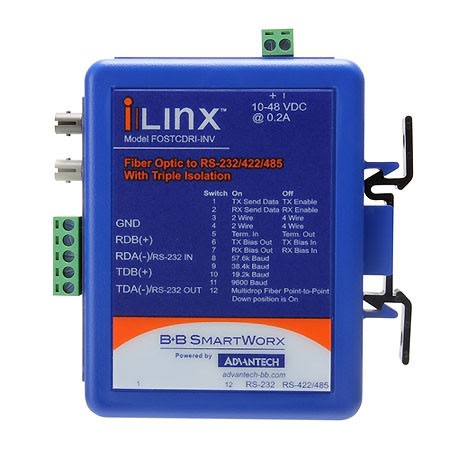 Converts serial data signals to multi-mode ST fiber optic Inverted fiber state - fiber light OFF in idle state 2 KV 3-way optical isolation (input/output/power); EMI/RFI protection Data rate: up to 115.2 kbps Wide operating temperature:
