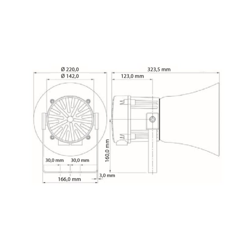 Diffuseur à voix numérisée enregistrable de 111 dB à 1 m (voix) et 126 dB à 1 m (son). Possibilité de diffusion de sons dont le son NFS 32001. Le pavillon permet encore une meilleure diffusion des sons et messages.2 minutes d'enregistrement (jusqu'à 4 messages de 30 secondes) Qualité de diffusion de sons et messages améliorée Facilité d'utilisation et d'enregistrement des messages Messages modifiables de façon illimitée Polyvalence: diffusion de sons et de messages Diffuseur robuste (IP66/67) pouvant être utilisé en milieu industriel sévère Efficacité sonore (300 m @ 1 KHz)