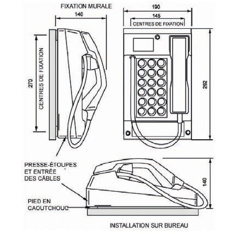 Ce téléphone analogique robuste, en polyester renforcé à la fibre de verre, permet de résister aux intempéries et aux conditions d'utilisation extrêmes.Cordon en acier inoxydable Montage mural ou à plat Contact sec de combiné disponible