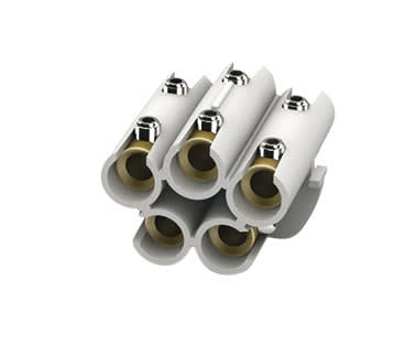 Connecteur aluminium étamé isolé cylindrique, 5 pôles, 1,5 - 10 mm². Pour connexion Cu-Cu, Al-AL, Al-Cu. Serrage par vis à tête 6 pans creux. Clé 6 pans fournie. Conforme à EN 60998-2-1.