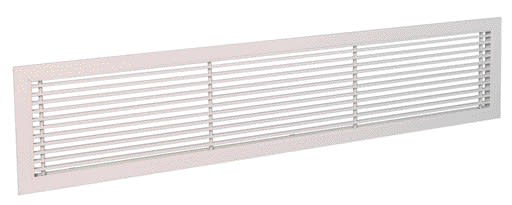 • Grille murale en aluminium simple déflexion Gridlined Wall pour la reprise d'air. • Design soigné et grande qualité d'éxécution. • 300x100 mm. • Finition avec peinture époxy blanche RAL 9010 mat 30%. • Fixation F3 pratique et discrète (non apparente) par clips à friction. • Barres frontales horizontales fixes avec déflexion 15°. • Cadre de largeur de 23 mm. • Accessoires : registres SGS (acier) ou AGB (aluminium brut) à mouvement contrarotatif, contre-cadre F4 ou F6 en tôle d’acier galvanisé, plénum de raccordement en tôle d’acier galvanisé avec piquage arrière type MT ou piquage côté type ME.