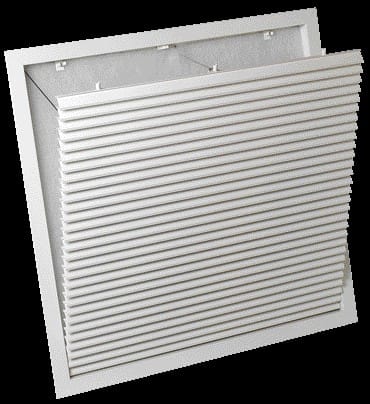 Grille plafond (reprise) ouvrante AG637 - Aluminium avec peinture époxy blanche RAL9010 30% - Pour dalle de 600x600 mm avec support T - Ailettes frontale fixe inclinée à 45° - Avec filtre G3 15 mm classé M1 (ISO Grossier 60%)