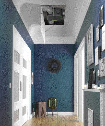 > Application : - Pour maison individuelle ou appartement,- Pour réseau de ventilation simple flux,- Rénovation,- Création d'une installation ou remplacement d'une ventilation existante,- Raccordement de 1 cuisine et jusqu'à 4 sanitaires.> Description : - Groupe COMBLES en matière plastique recyclable : 1 piquage Ø125 cuisine, 4 piquages Ø80 sanitaires, 1 rejet Ø160/125,- Débits extraits régulés en fonction du taux de polluants detectés, grâce à des capteurs électroniques COV et H2O situés au niveau du moto-ventilateur,- Moteur AC 2 vitesses.