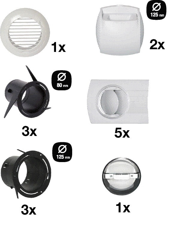 Kit manchettes et bouches Auto pour logement de type T3/T4 extraction D125 /insufflation bio D80 pour réseau VMC double-flux en maison individuelle