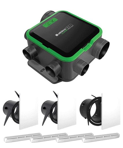 > Application : - Pour maison individuelle ou appartement,- Pour réseau de ventilation simple flux- Rénovation,- Création d'une installation ou remplacement d'une ventilation existante,- Raccordement de 1 cuisine et jusqu'à 4 sanitaires.> Description : - Groupe COMBLES en matière plastique recyclable : 1 piquage Ø125 cuisine, 4 piquages Ø80 sanitaires, 1 rejet Ø160/125,- Débits extraits régulés en fonction du taux de polluants detectés, grâce à des capteurs électroniques COV et H2O situés au niveau du moto-ventilateur,- Moteur AC 2 vitesses.