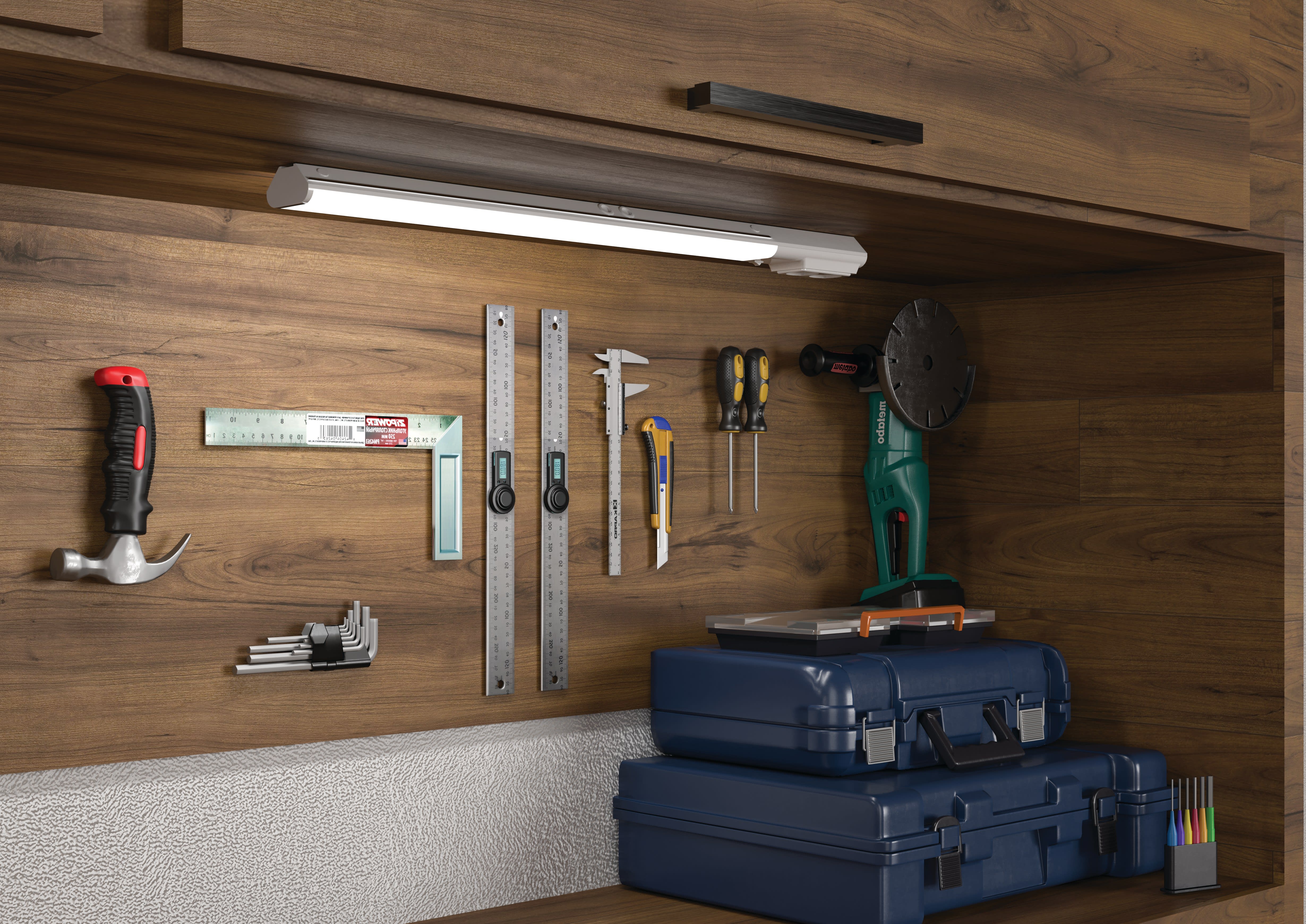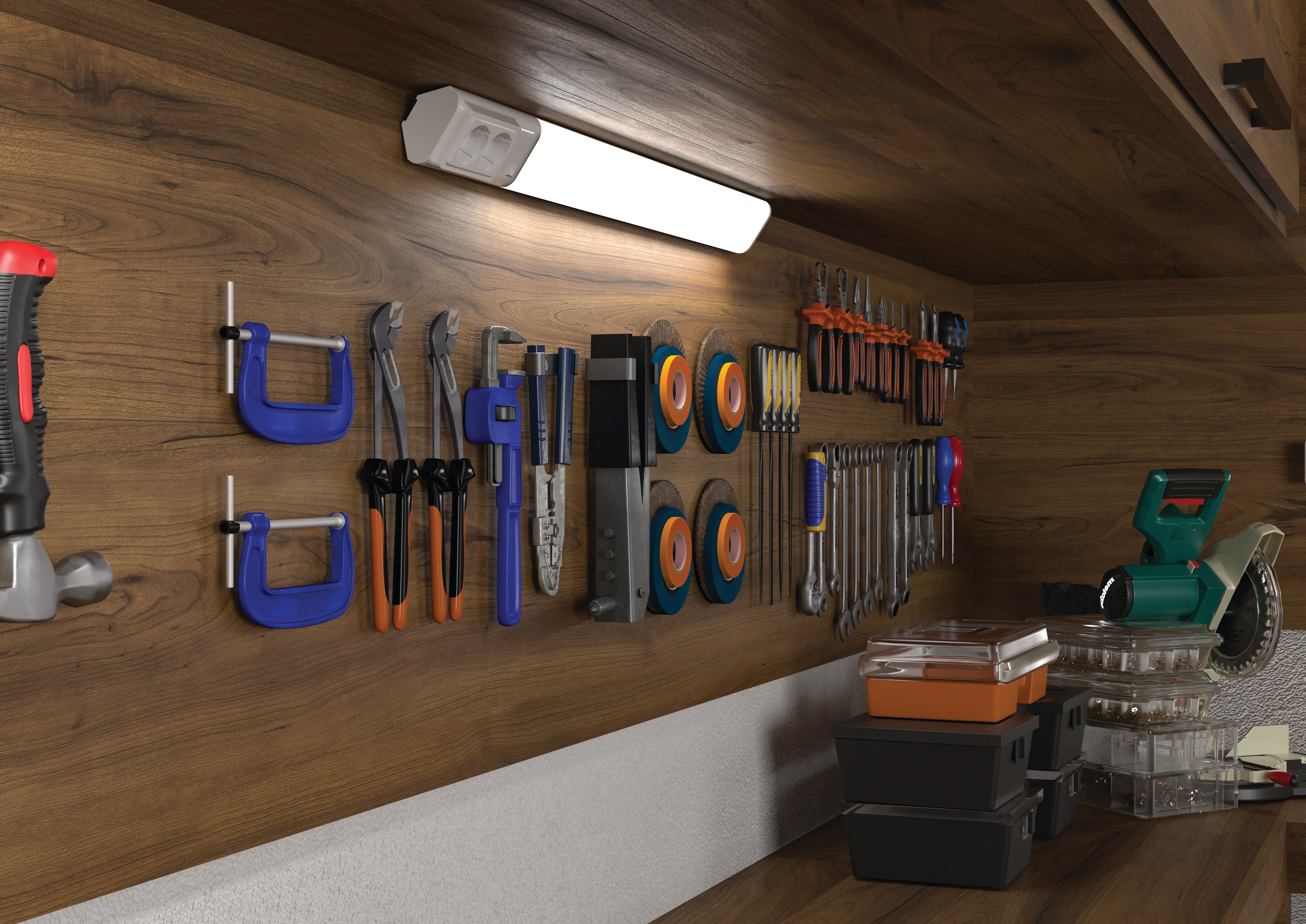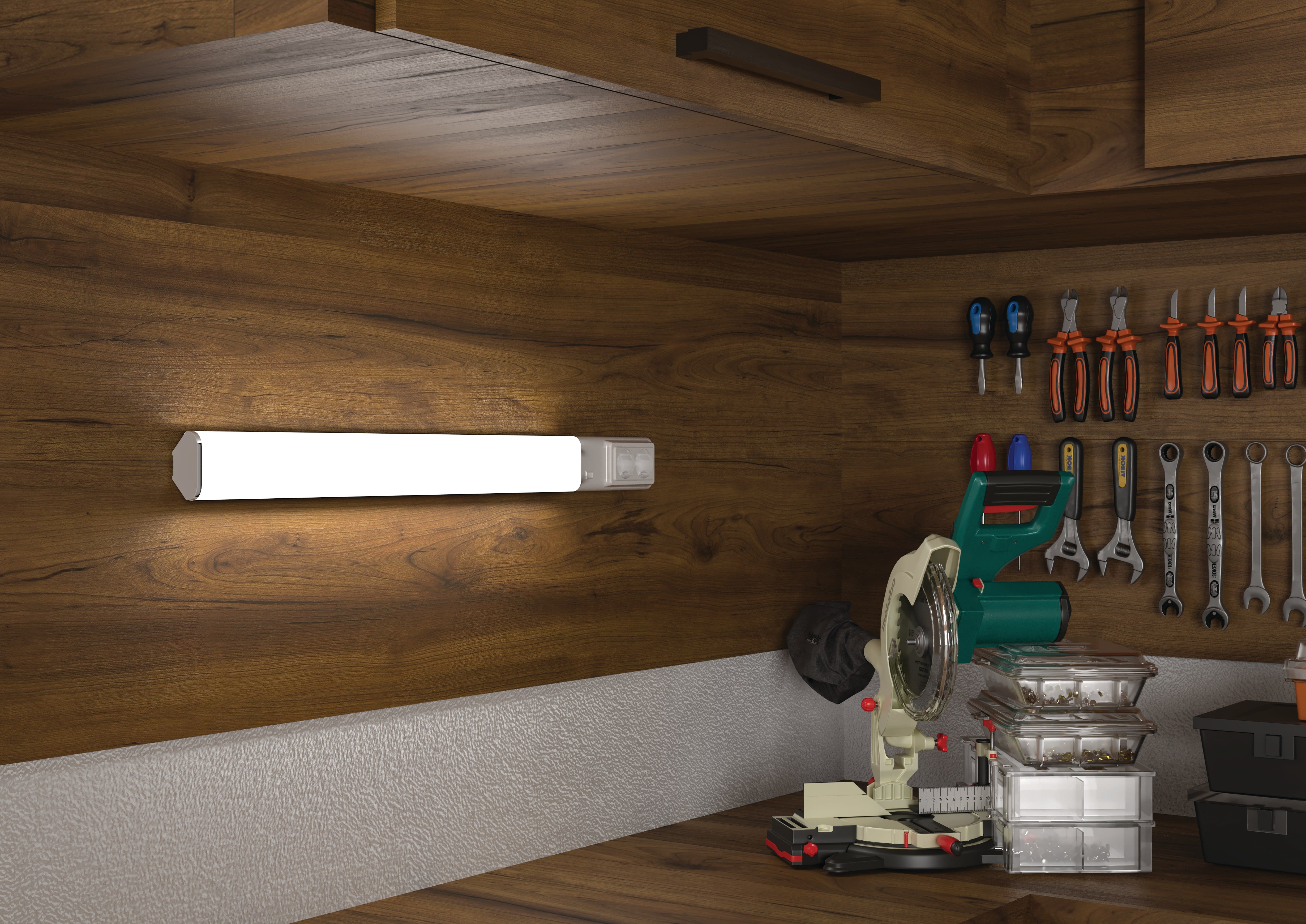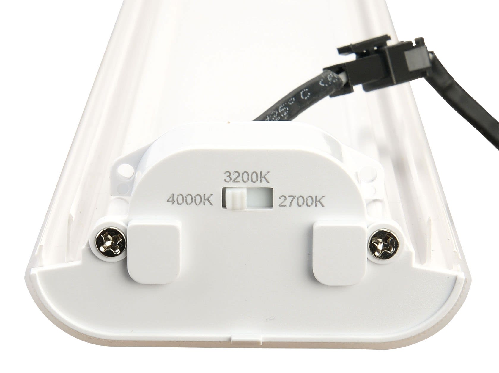 Applique / Réglette, Cuisine, Salle de bain, Garage AMY 800MM 12W 3CCT, 3 positions d’installation possibles : plafond, angle, applique murale, Technologie CCT 3 couleurs : 2700 K / 3200 K / 4000 K Interrupteur réglable sous la vasque, Interrupteur on/off et 2 prises