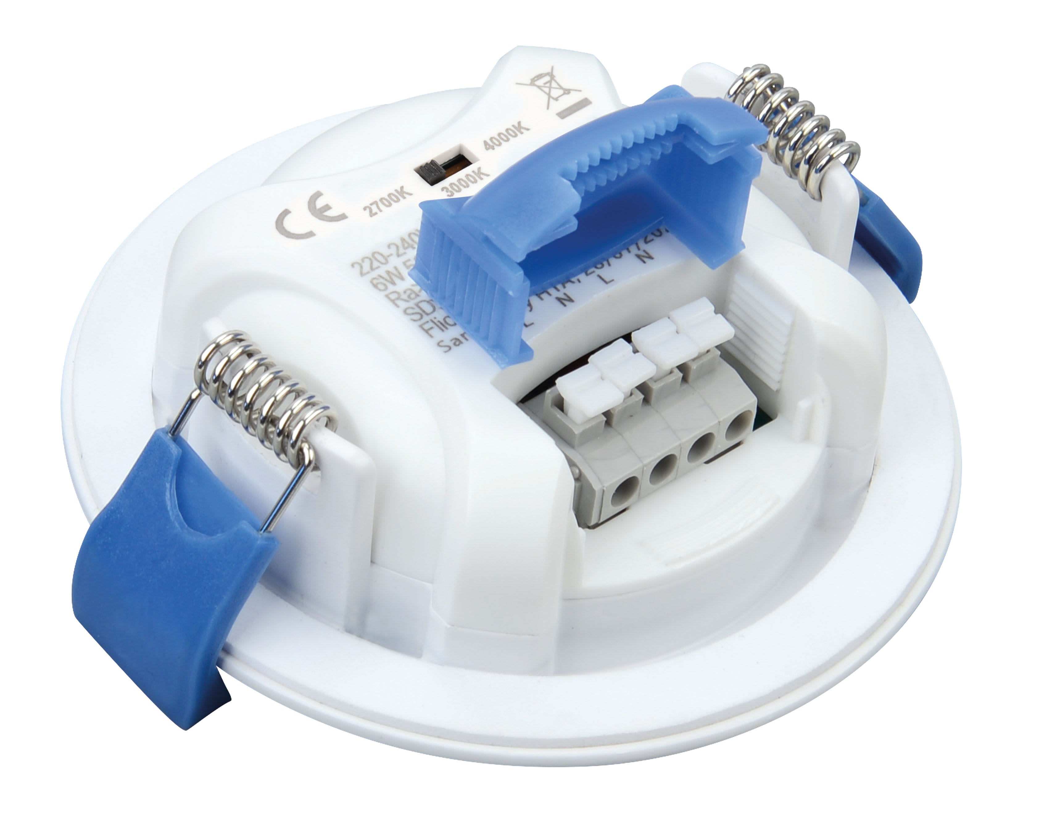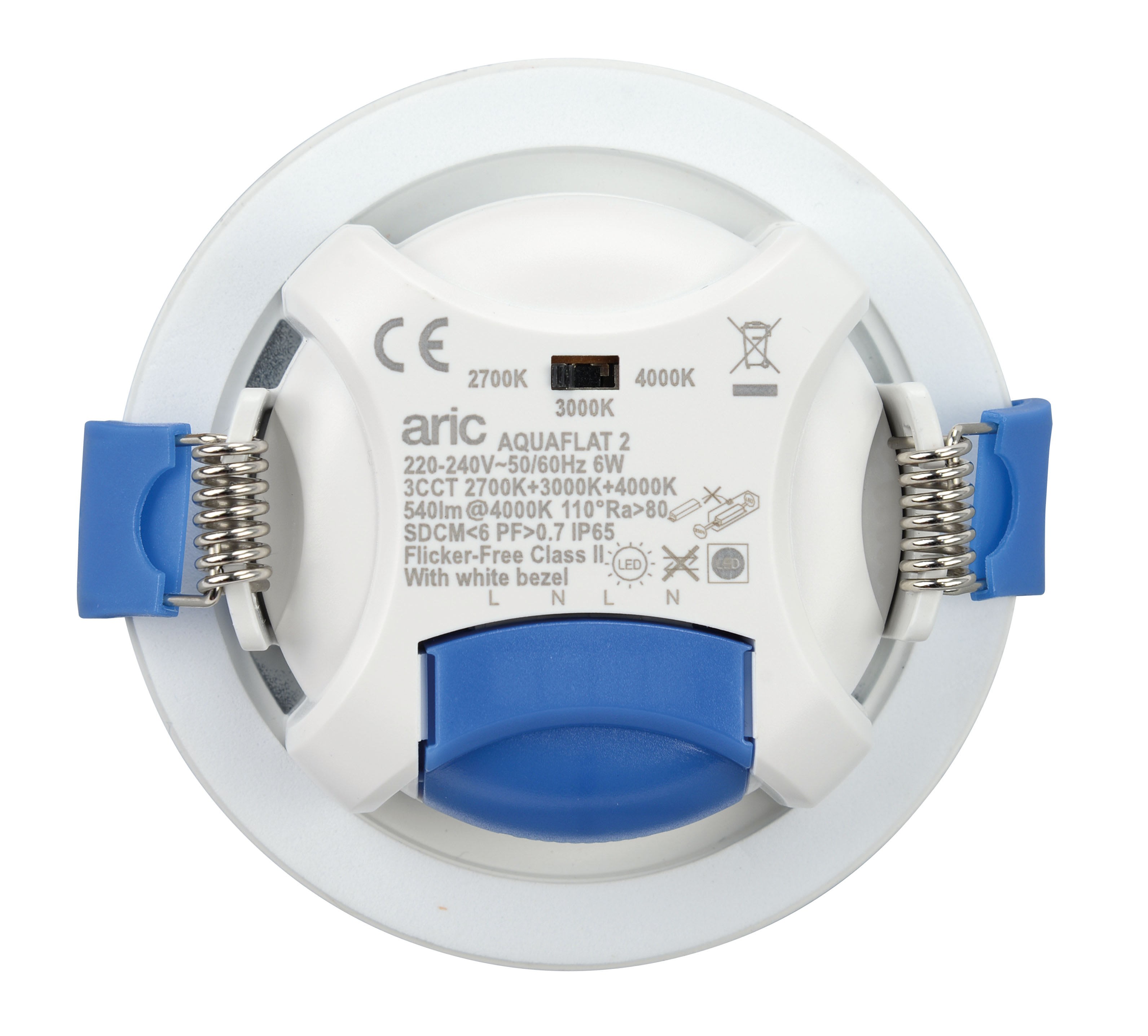 Spot encastré AQUAFLAT 6W 3CCT 27-30-40K BLANC, Technologie CCT 3 couleurs : 2700 K / 3000 K/4000 K Interrupteur à l’arrière du spot (codes 51550 - 51551 - 51552), Recouvrable, Hauteur réduite : 29 mm, Compatible norme RE2020, Faisceau large 110°, Driver intégré