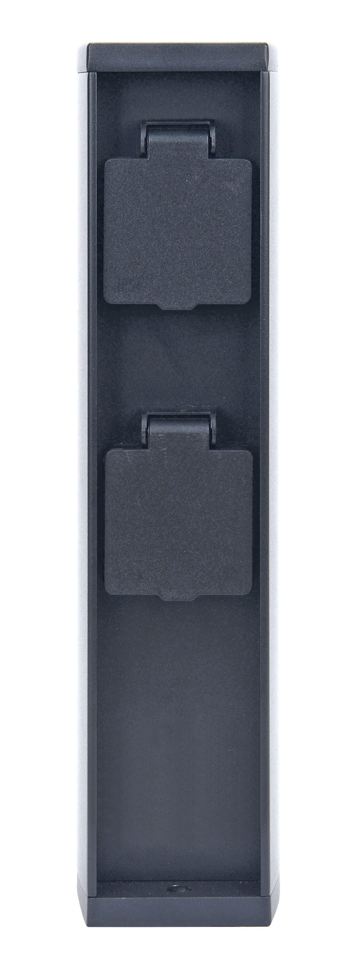 Borne extérieure 2 PRISES IP44 + CX IP68, , Borne 2 prises 16A convient pour raccordement jusqu’à 4000W, Corps aluminium anthracite, Fournie avec 2 tiges de fixation, Précâblée avec connecteur IP68