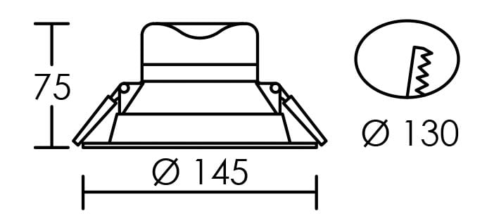 Corps en aluminium pour une meilleure dissipation thermique - Durée de vie de 30'000 heures - Angle symétrique de 90° avec diffuseur opale en retrait pour un meilleur confort visuel - Alimentation intégrée - Technologie LED, 95 lumens par Watt, économies d’énergies - IP44, compatible volume 2 Salle de bain - Diamètre d’encastrement 130mm