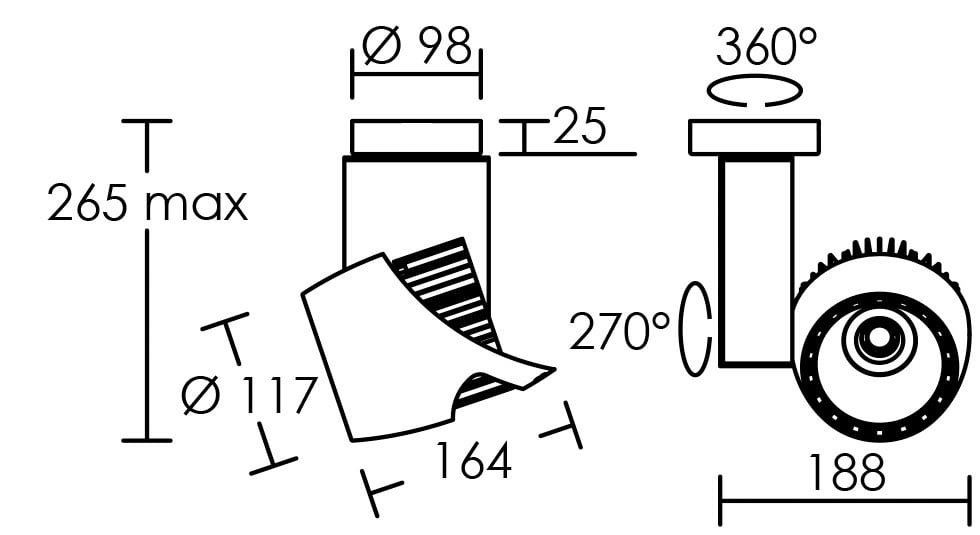 Projecteur sur rail Made in France - IRC>90, SDCM<3 - Flicker Free - Facteur de puissance 0.95, Taux de distorsion harmonique <15% - 100lm/W - Angle de diffusion de 36°, autres options possibles - Température de couleur : 4000K - Couleur de finition : Noir RAL 9011, Mat 30% - Orientation possible sur 360° horizontal et 270° vertical - Driver déporté