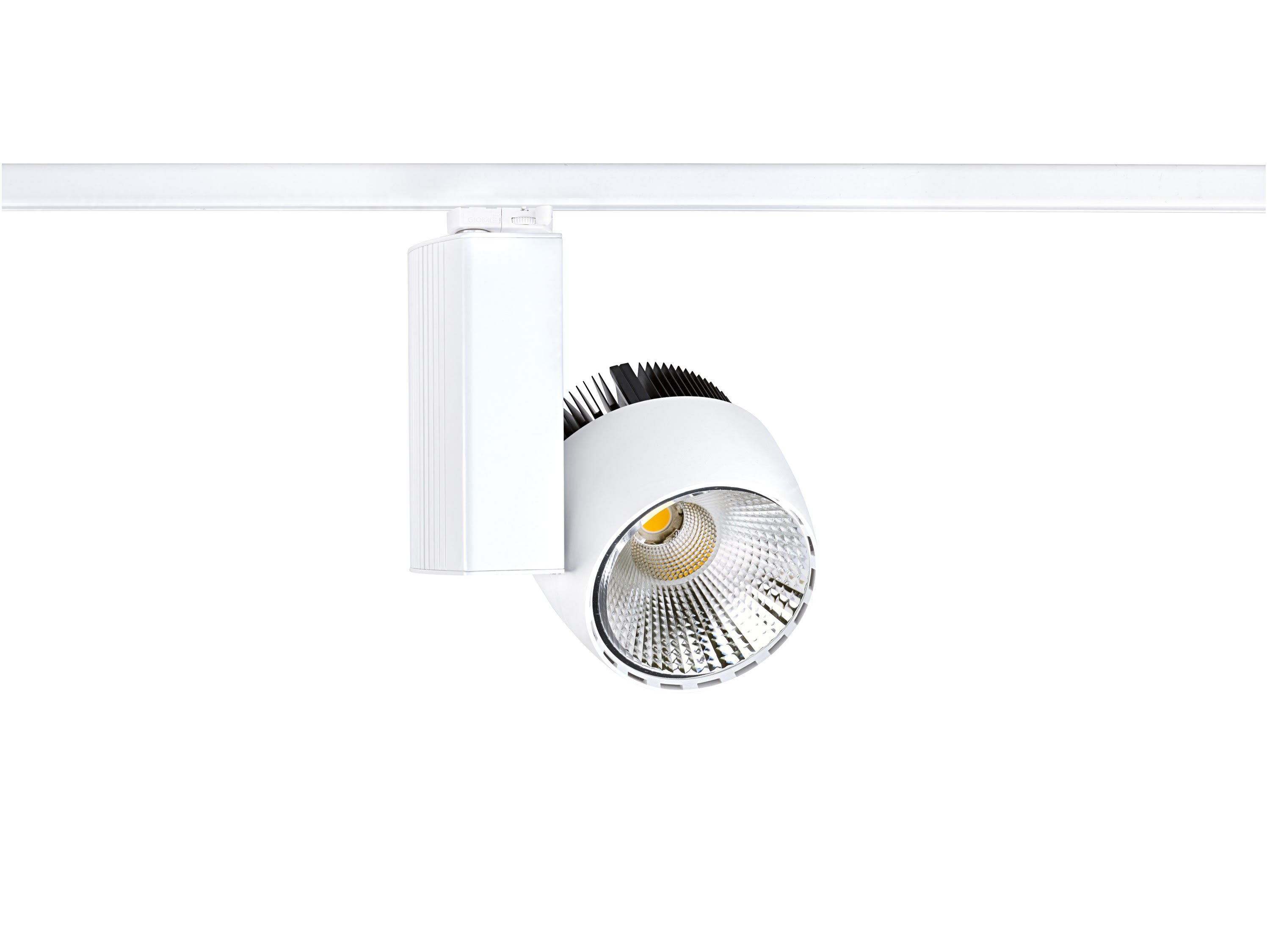 Projecteur sur rail Made in France - IRC>90, SDCM<3 - Flicker Free - Facteur de puissance 0.95, Taux de distorsion harmonique <15% - 100lm/W - Angle de diffusion de 60°, autres options possibles - Température de couleur : 3000K - Couleur de finition : Blanc RAL 9003, Mat 30% - Orientation possible sur 360° horizontal et 270° vertical - Driver déporté