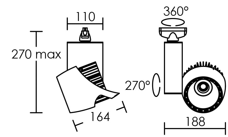Projecteur sur rail Made in France - IRC>90, SDCM<3 - Flicker Free - Facteur de puissance 0.95, Taux de distorsion harmonique <15% - 100lm/W - Angle de diffusion de 60°, autres options possibles - Température de couleur : 3000K - Couleur de finition : Blanc RAL 9003, Mat 30% - Orientation possible sur 360° horizontal et 270° vertical - Driver déporté