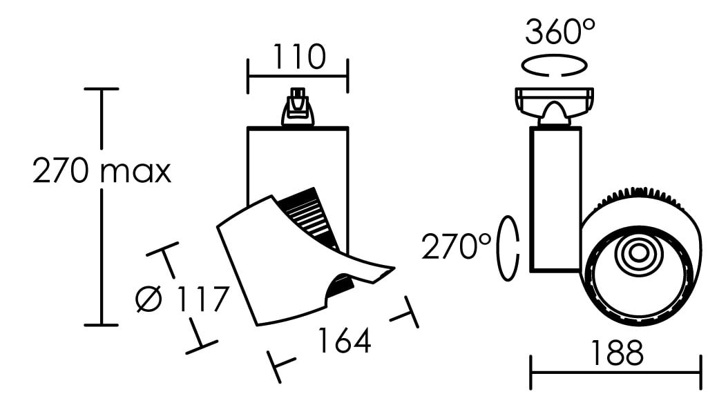 Projecteur sur rail Made in France - IRC>90, SDCM<3 - Flicker Free - Facteur de puissance 0.95, Taux de distorsion harmonique <15% - 100lm/W - Angle de diffusion de 60°, autres options possibles - Température de couleur : 4000K - Couleur de finition : Blanc RAL 9003, Mat 30% - Orientation possible sur 360° horizontal et 270° vertical - Driver déporté