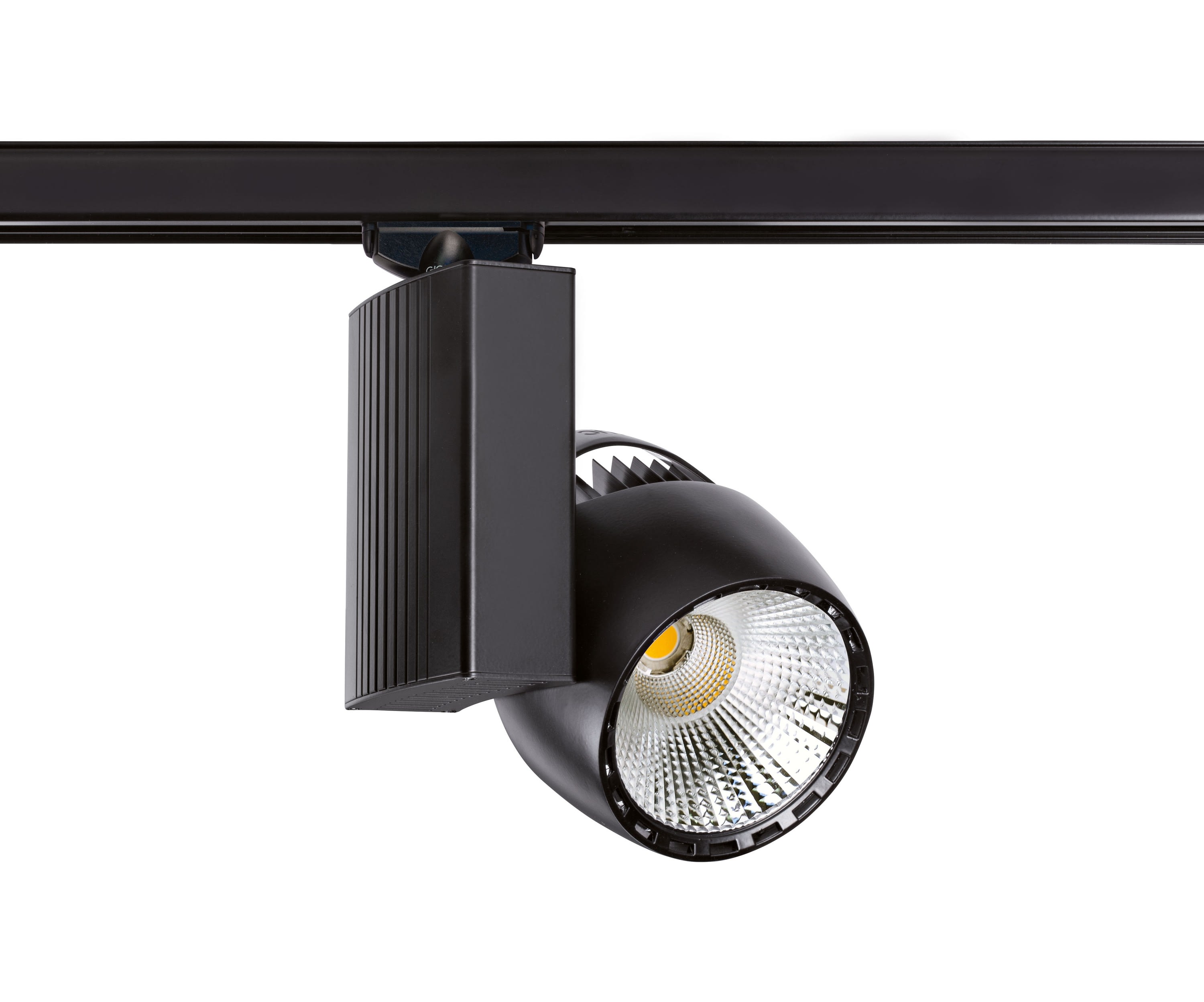 Projecteur sur rail Made in France - IRC>90, SDCM<3 - Flicker Free - Facteur de puissance 0.95, Taux de distorsion harmonique <15% - 100lm/W - Angle de diffusion de 60°, autres options possibles - Température de couleur : 3000K - Couleur de finition : Noir RAL 9011, Mat 30% - Orientation possible sur 360° horizontal et 270° vertical - Driver déporté