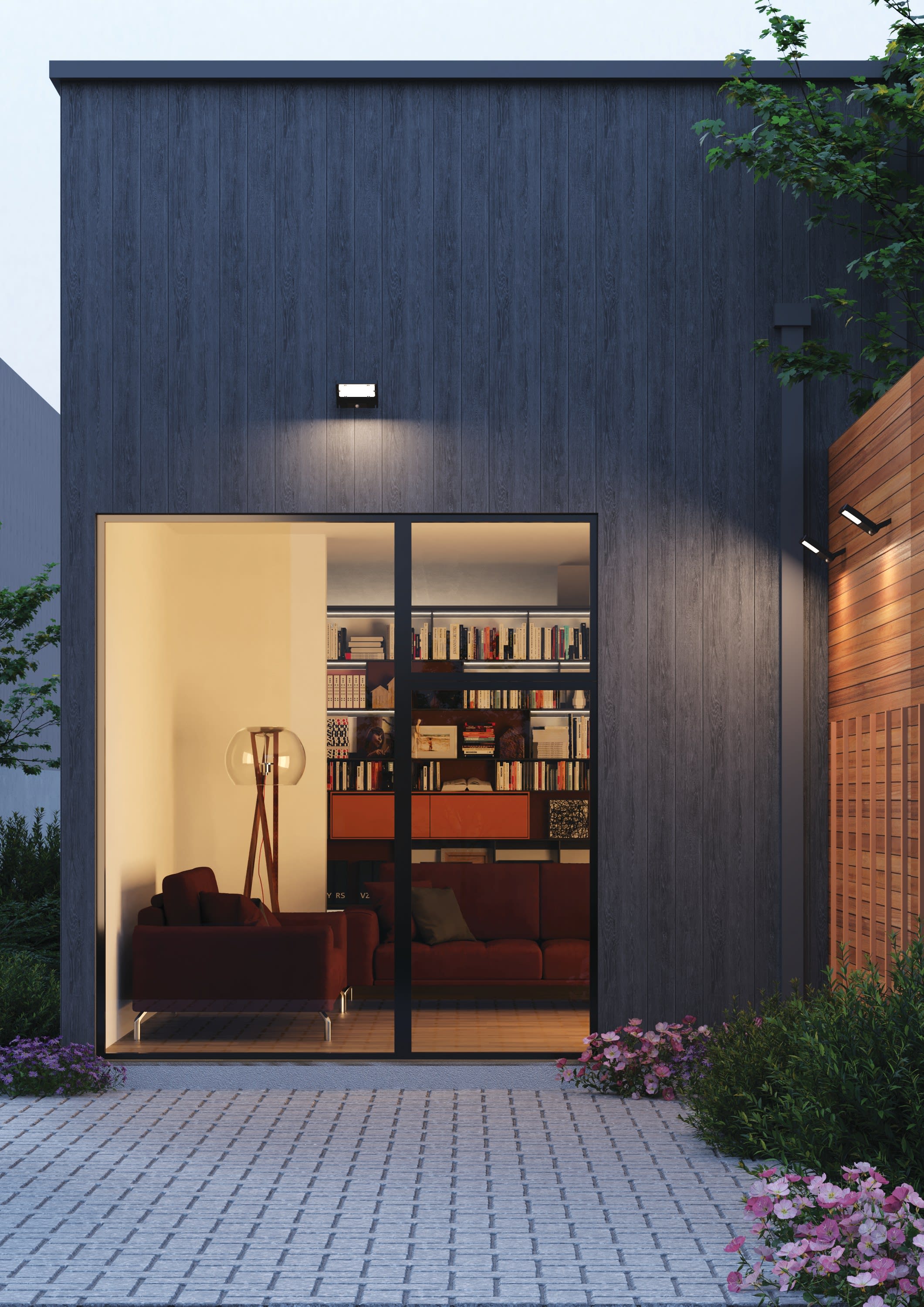 Projecteur extérieur LED IP65 IK08, noir, symétrique, faisceau 110° LED intégré 30W 3000K, flux sortant 3000 lumens (IRC <80), durée de vie 35000h, test BS = 480h