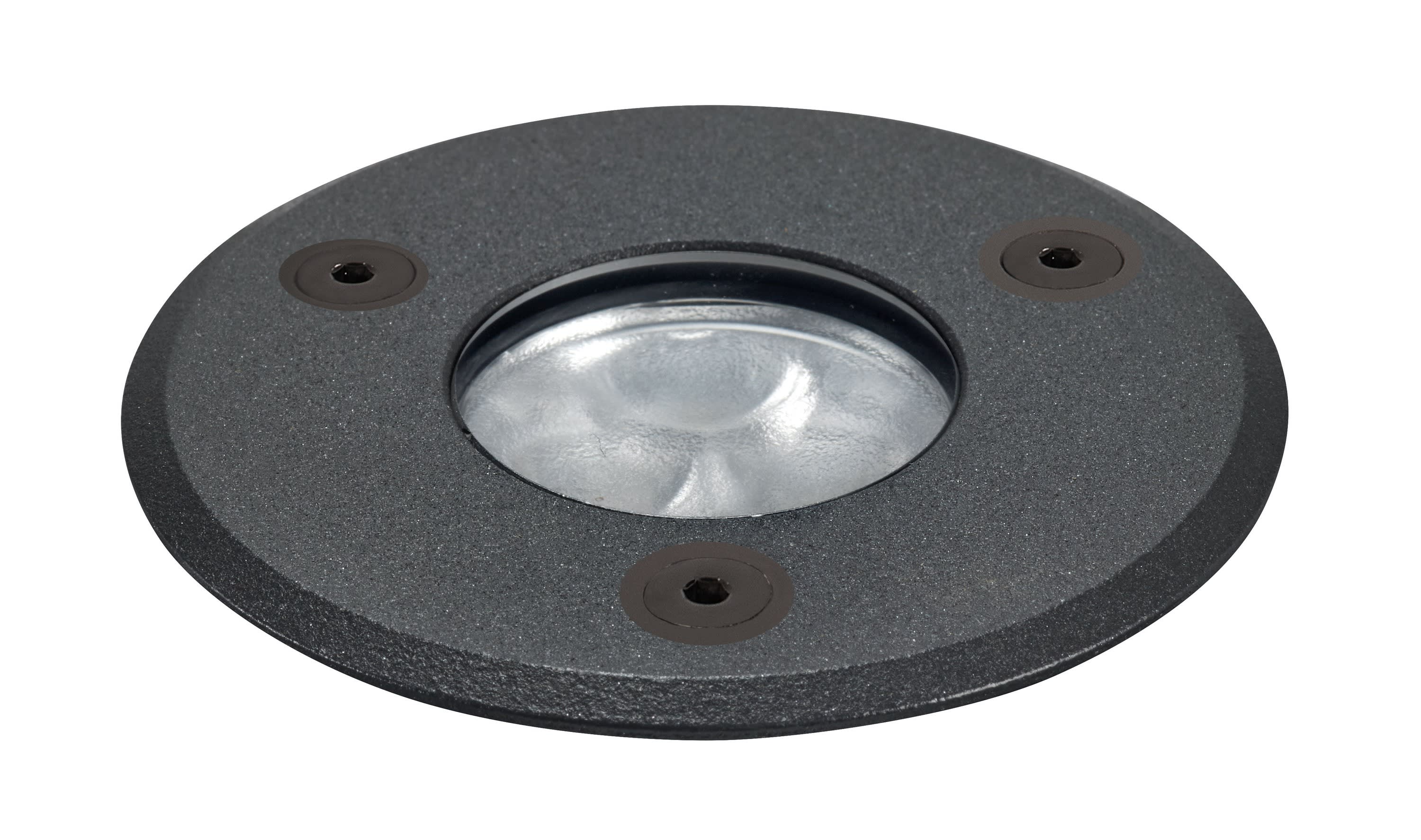 Encastré de sol Extérieur IP67 IK08, rond Ø80, collerette aluminium noir, LED 24V DC 5,5W 3000K 40°, flux sortant 380lm, 60000H