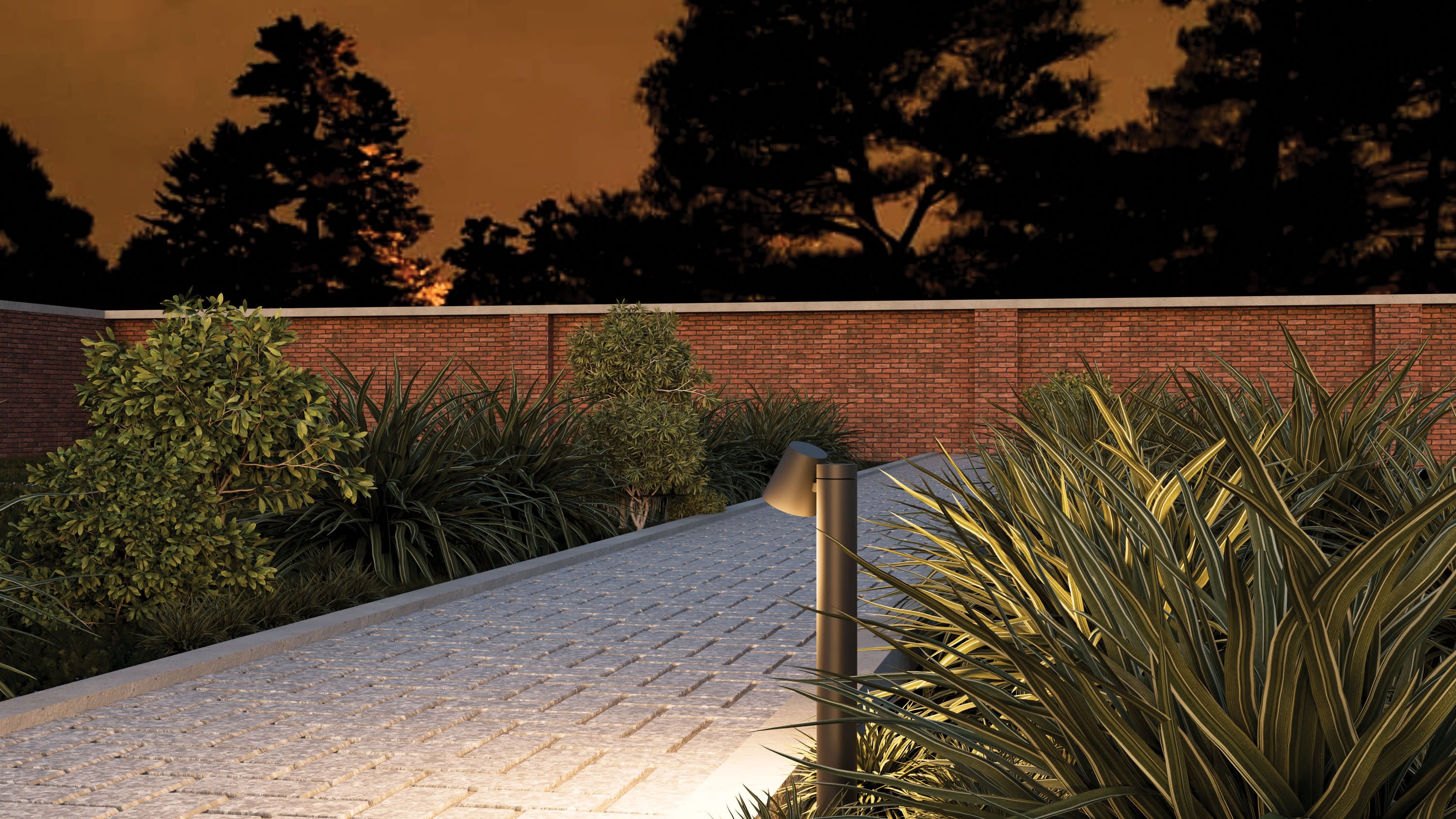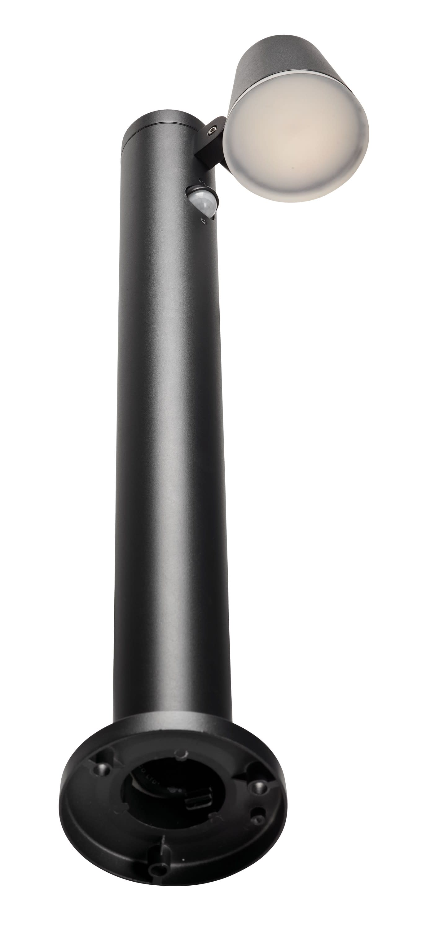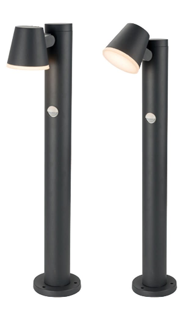 Tête orientable verticalement sur 75° - Faisceau lumineux orienté vers le bas, conforme à la règlementation sur la pollution lumineuse - Hauteur de 60cm, avec tige de fixation pour ancrage dans béton fourni