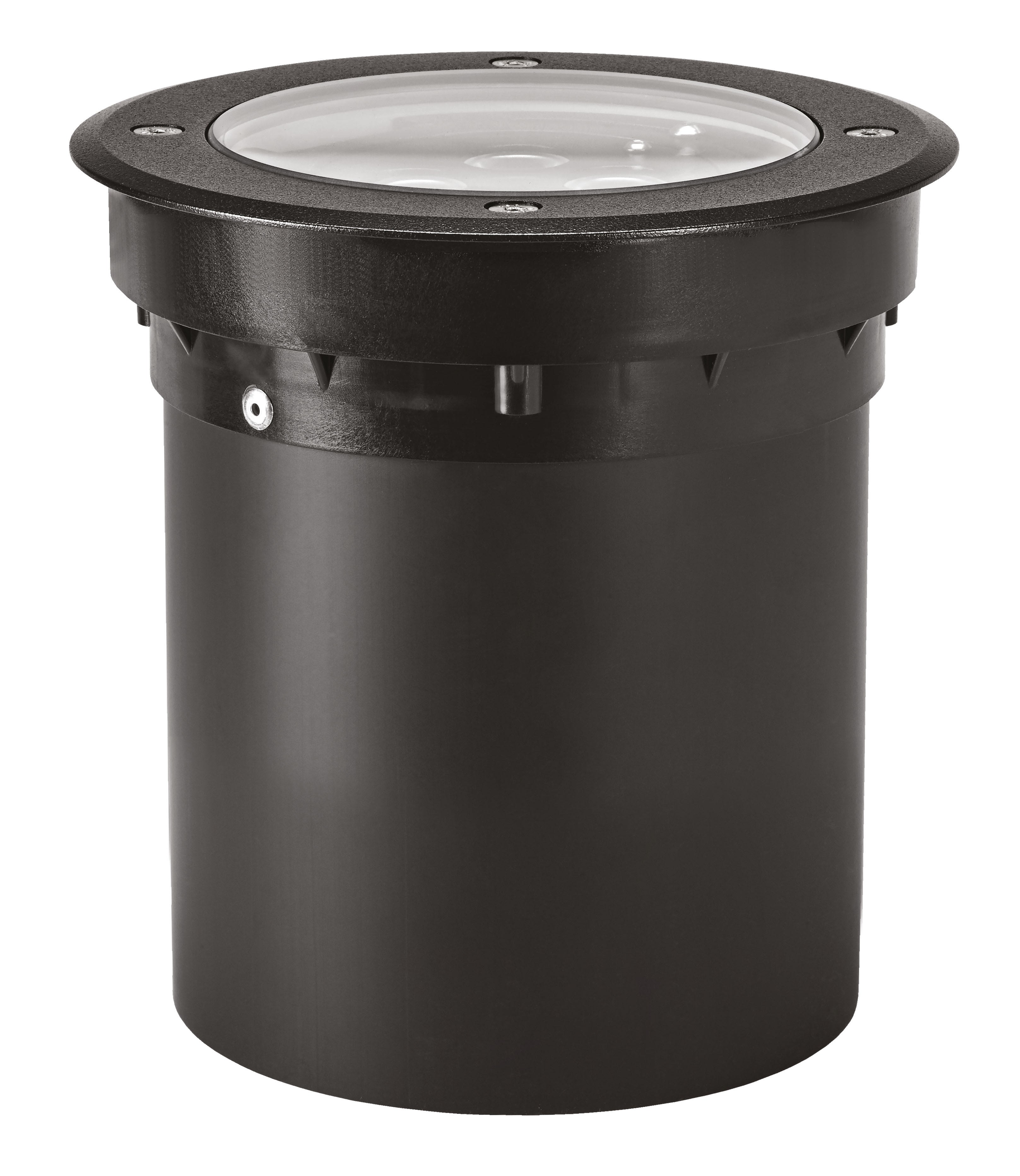 Encastré de sol Extérieur IP67 IK10 TECNISOL 200 Rond ASY 3000K NOIR, Faisceau Asymétrique, Corps aluminium, Verre trempé transparent, Collerette aluminium ou inox 316L selon version, Boîte d’encastrement fournie, Alimentation intégrée, Précâblage H07RN-F - 2m, Protection thermique par fusible