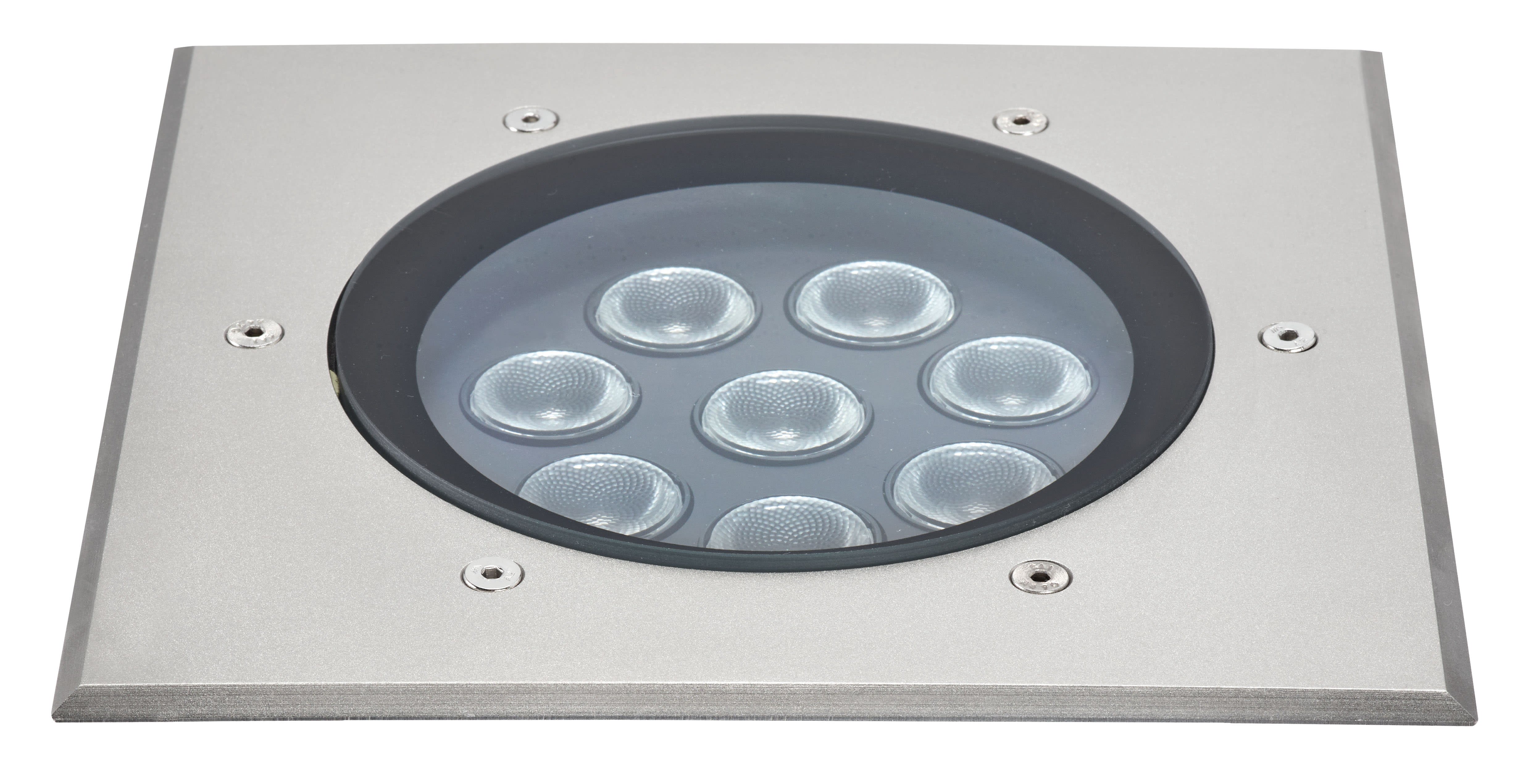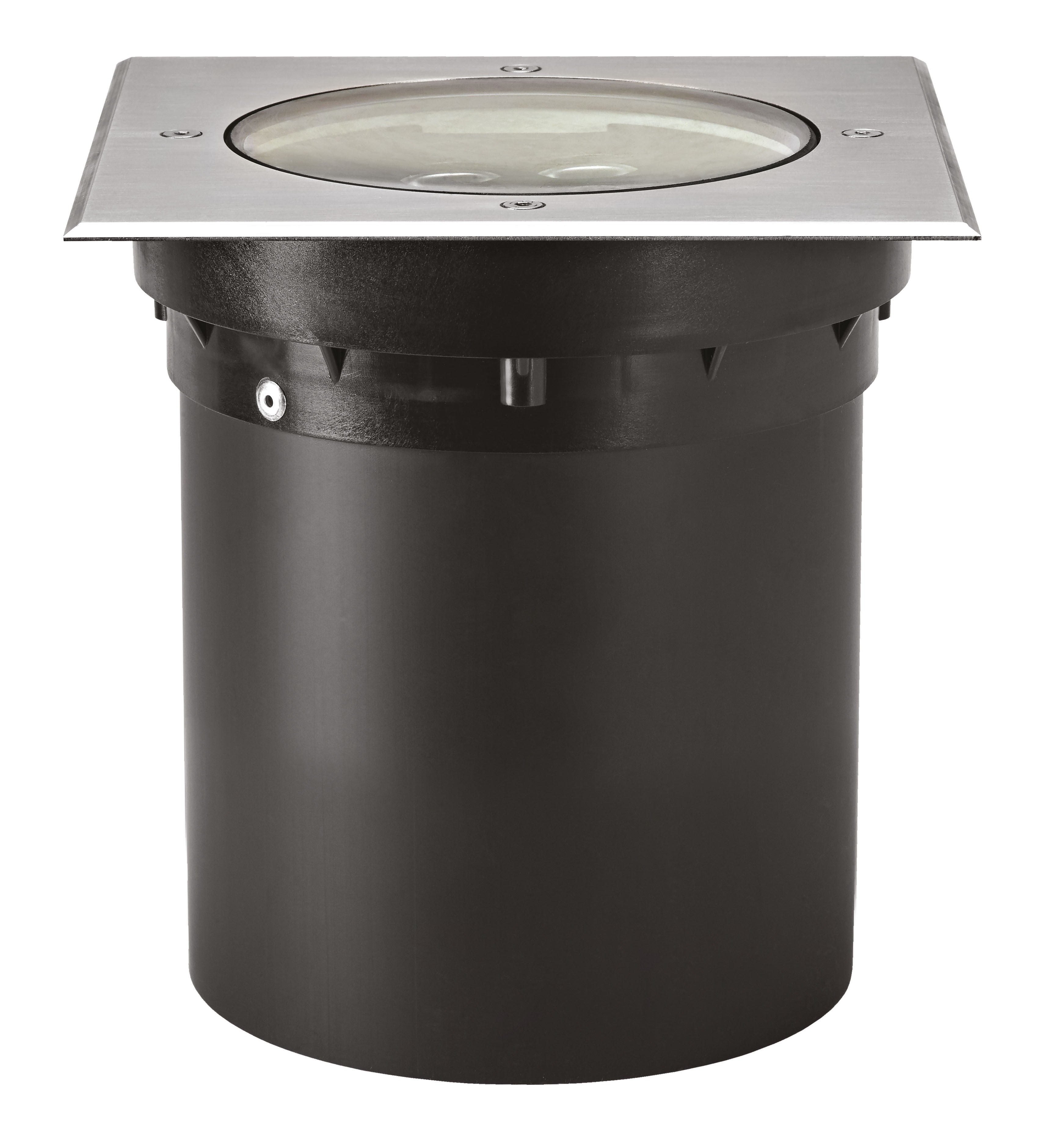 Encastré de sol Extérieur IP67 IK10 TECNISOL 200 Carré 60° 3000K INOX , Faisceau symétrique, Corps aluminium, Verre trempé transparent, Collerette aluminium ou inox 316L selon version, Boîte d’encastrement fournie, Alimentation intégrée, Précâblage H07RN-F - 2m, Protection thermique par fusible