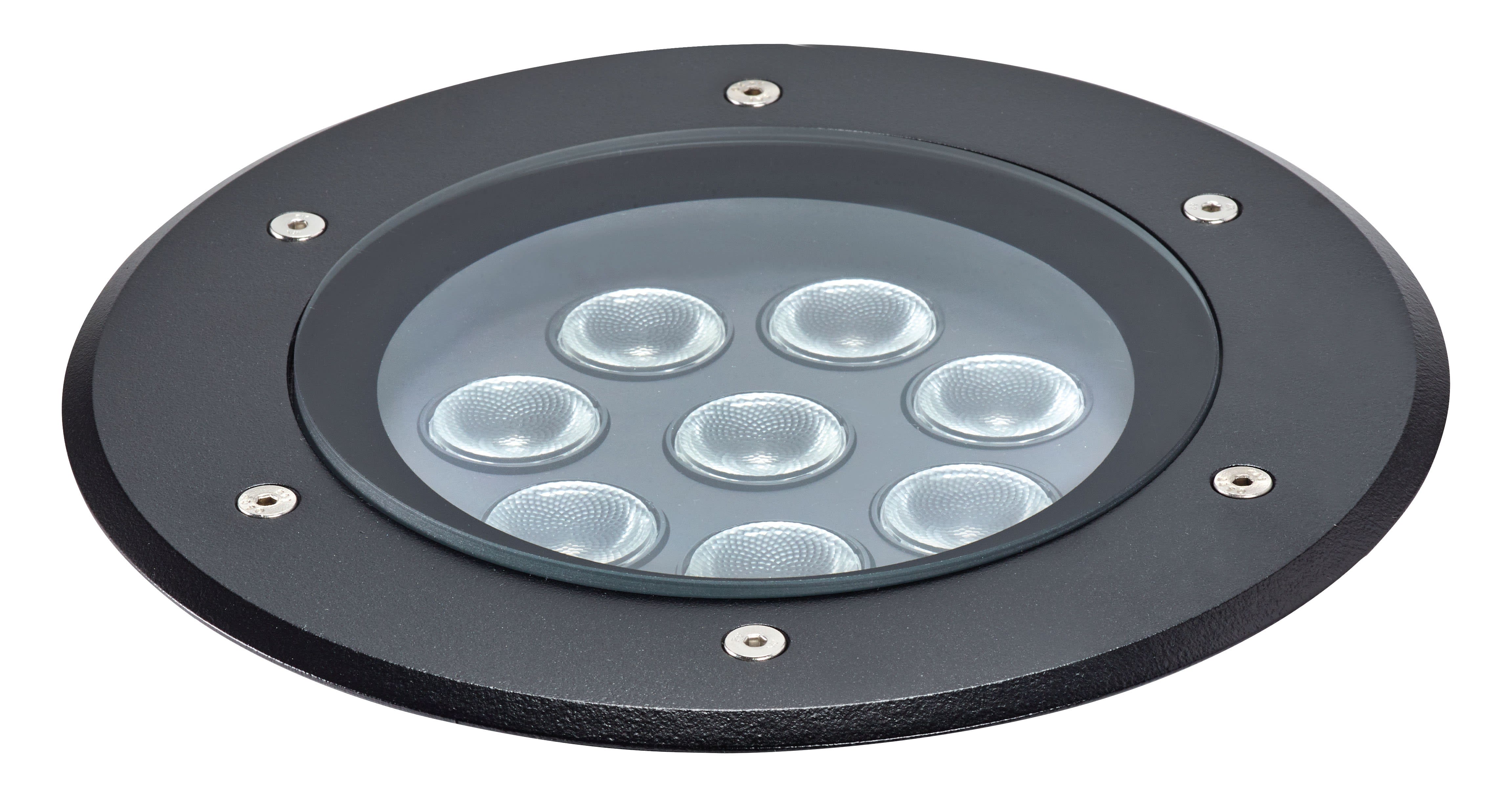 Encastré de sol Extérieur IP67 IK10 TECNISOL 200 Rond 60° 4000K NOIR , Faisceau symétrique, Corps aluminium, Verre trempé transparent, Collerette aluminium ou inox 316L selon version, Boîte d’encastrement fournie, Alimentation intégrée, Précâblage H07RN-F - 2m, Protection thermique par fusible