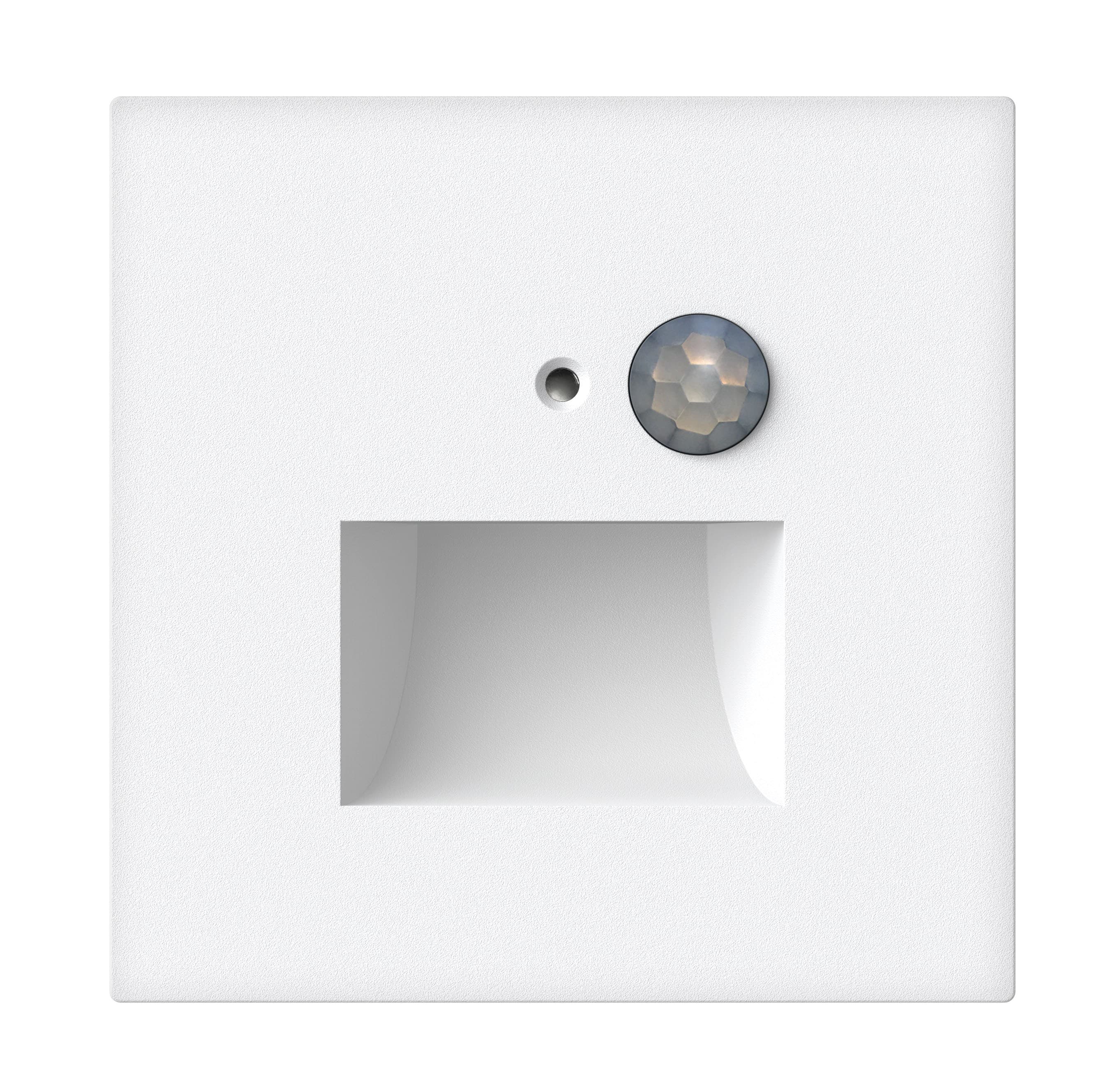 Encastré mural à détection WALL CARRE 3CCT 2W SENSOR BLANC, Détecteur de mouvement infra-rouge et crépusculaire automatique avec temporisation à 120 secondes, Technologie CCT 3 couleurs : 2700 K / 3200 K / 4000 K Réglable par interrupteur à l’arrière du spot, Bornier repiquable sans outil, Boite d’encastrement étanche fournie