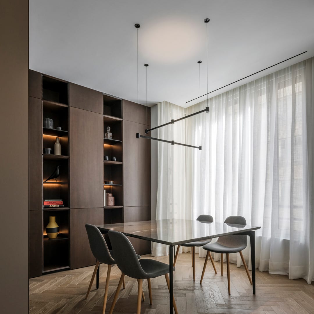 Art Direct & Indirect - Modular - Surface Confort visuel optimal Câble suspension + allimentation Câbles ultra-fin (1mm) Différentes finitions de couleurs. Intersection parfaite Minimaliste Même esthétique ON/OFF Sculpturale Effet « The Invisible Black »