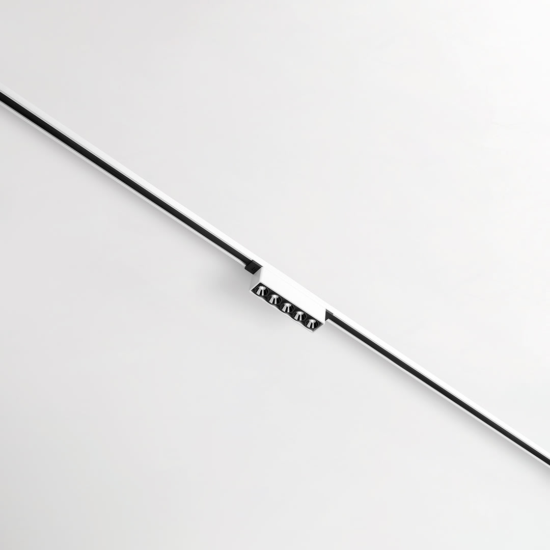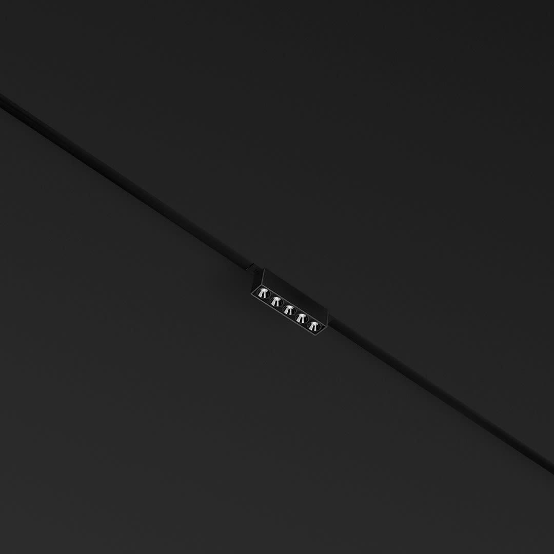 Profilé ultrafin en aluminium anodisé noir mat. Rail en saillie avec effet visuel trimless. Uniformité visuelle, ligne minimaliste noire. Miniaturisation optimale du rail, des luminaires et des composants.