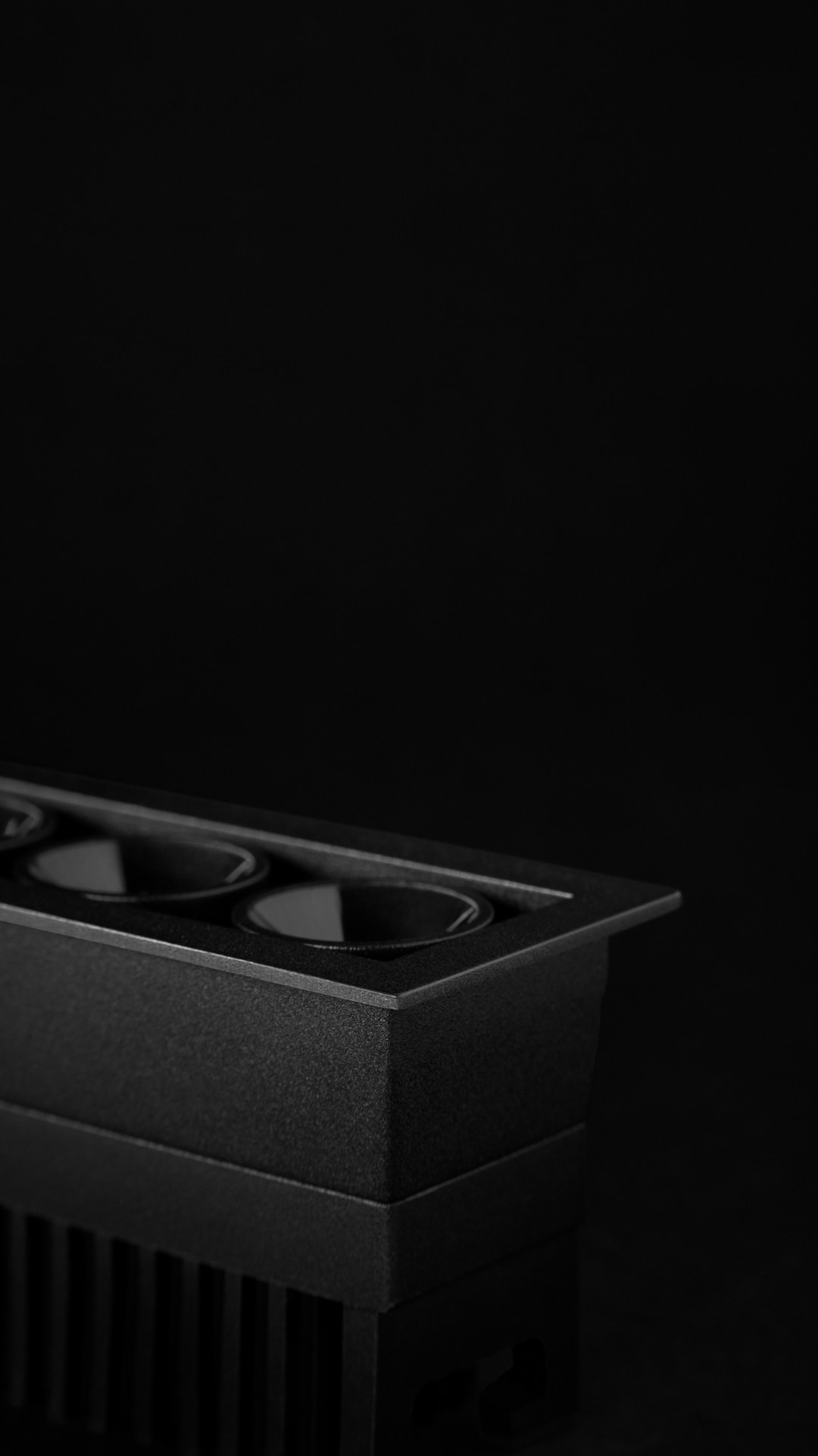 Effet « The Invisible Black » : la source de lumière est pratiquement invisible. Il conserve la même esthétique, qu’il soit allumé ou éteint. Luminaire extrêmement miniaturisé. Esthétique de trimless visuelle. Éblouissement très faible. UGR minimum. Confort visuel maximum. Micro spot encastrable au format rectangulaire.