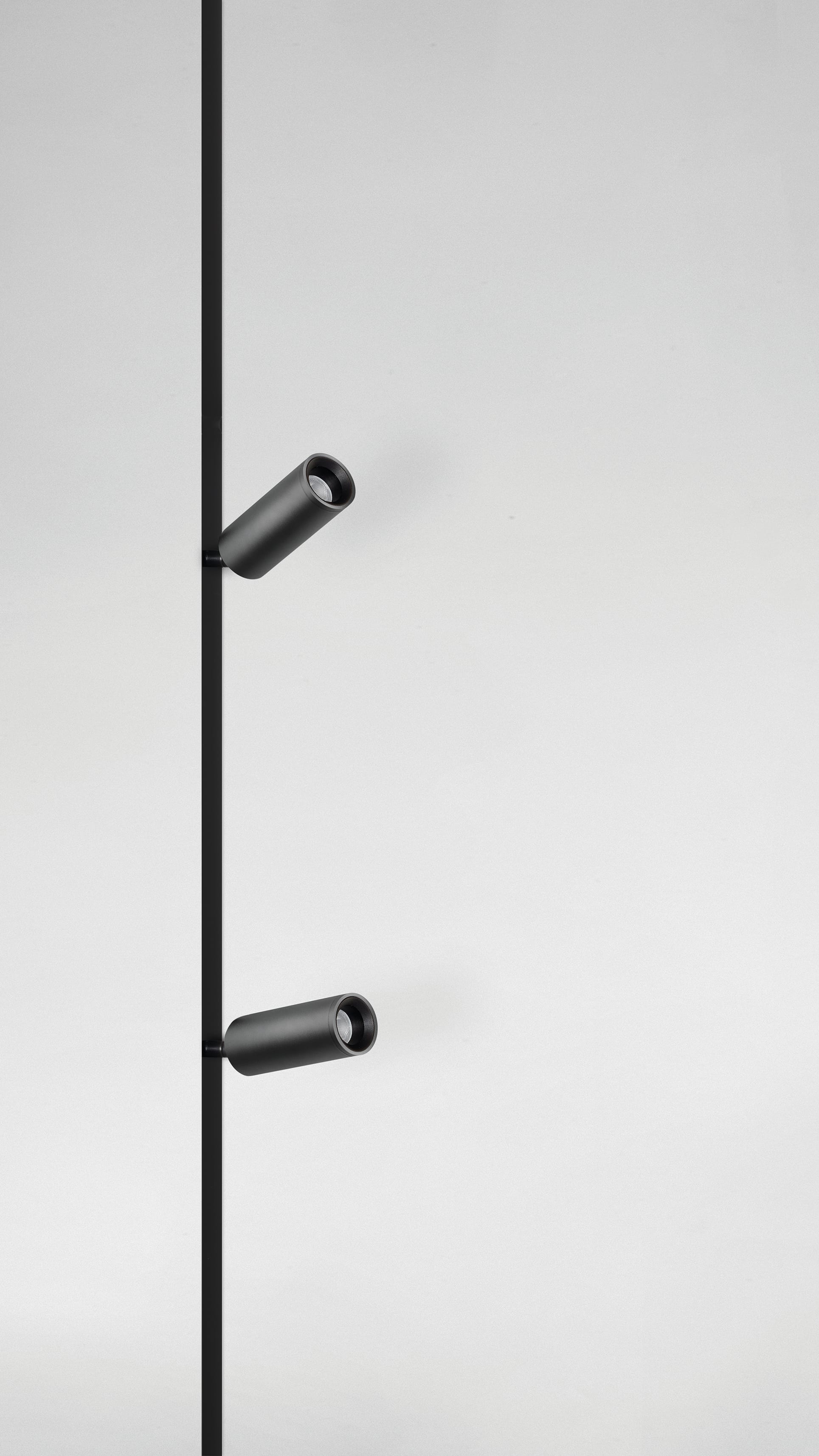 Géométrie cylindrique et de formes essentielles. Minimalisme esthétique et fonctionnalité. Projecteur pour applications de rails 48V.