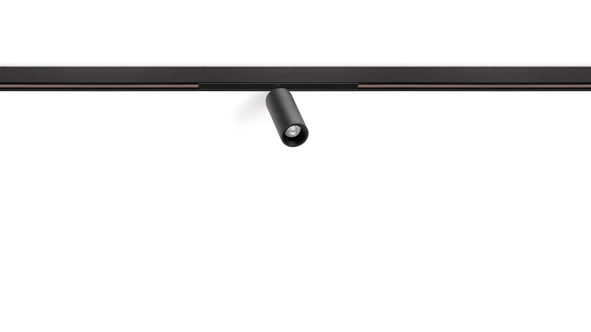 Géométrie cylindrique et de formes essentielles. Minimalisme esthétique et fonctionnalité. Projecteur pour applications de rails 48V.