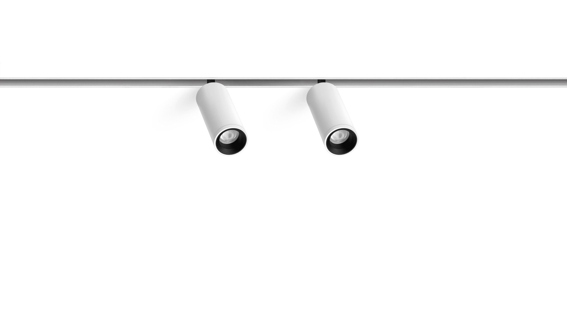 Géométrie cylindrique et de formes essentielles. Minimalisme esthétique et fonctionnalité. Projecteur pour applications de rails 48V.