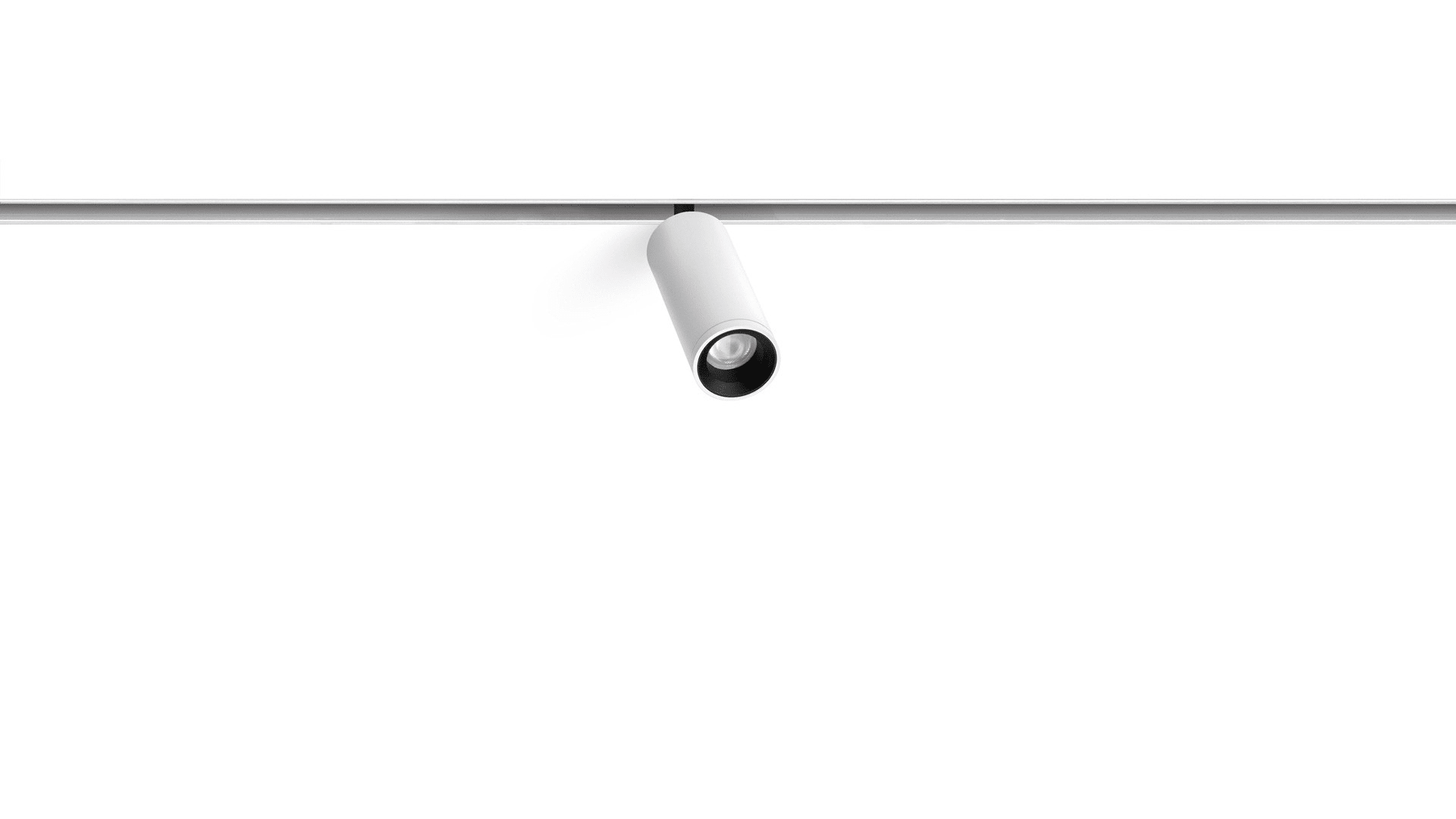 Géométrie cylindrique et de formes essentielles. Minimalisme esthétique et fonctionnalité. Projecteur pour applications de rails 48V.