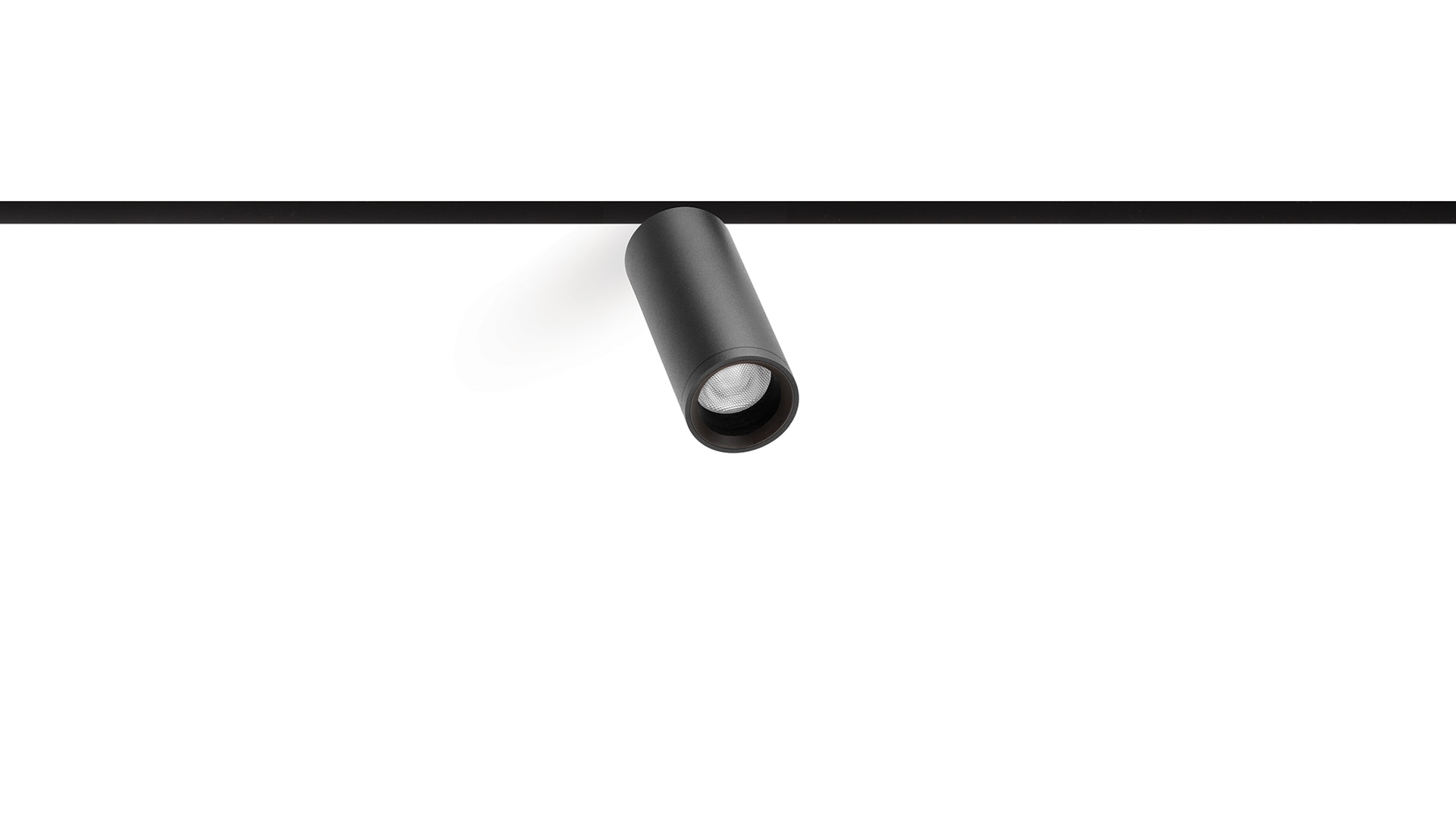 Géométrie cylindrique et de formes essentielles. Minimalisme esthétique et fonctionnalité. Projecteur pour applications de rails 48V.