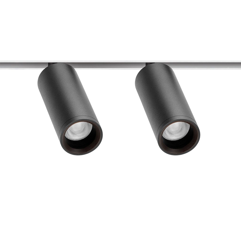 Géométrie cylindrique et de formes essentielles. Minimalisme esthétique et fonctionnalité. Projecteur pour applications de rails 48V.