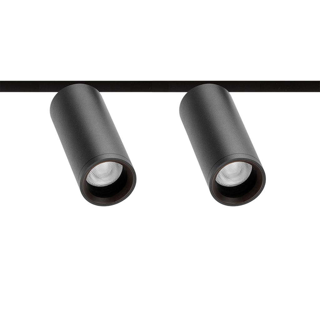 Géométrie cylindrique et de formes essentielles. Minimalisme esthétique et fonctionnalité. Projecteur pour applications de rails 48V.