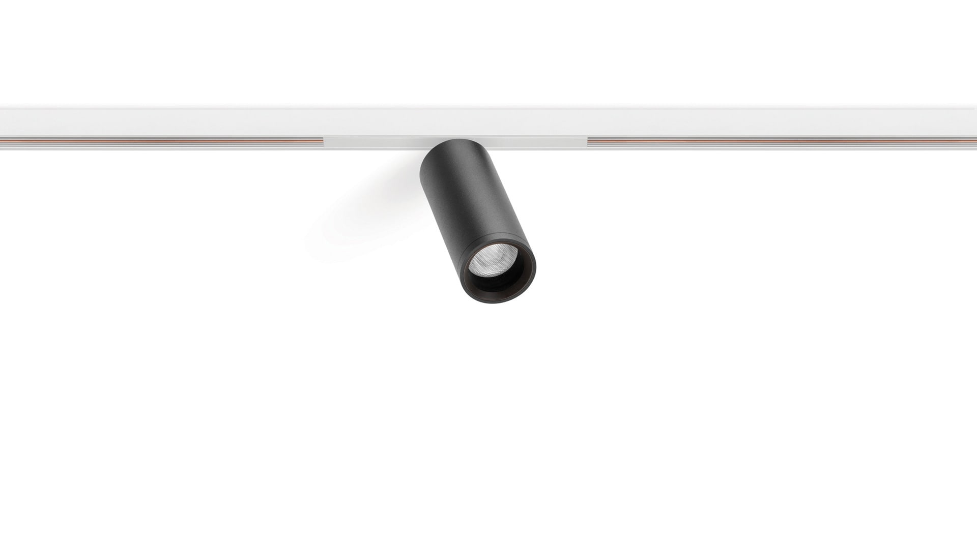 Géométrie cylindrique et de formes essentielles. Minimalisme esthétique et fonctionnalité. Projecteur pour applications de rails 48V.