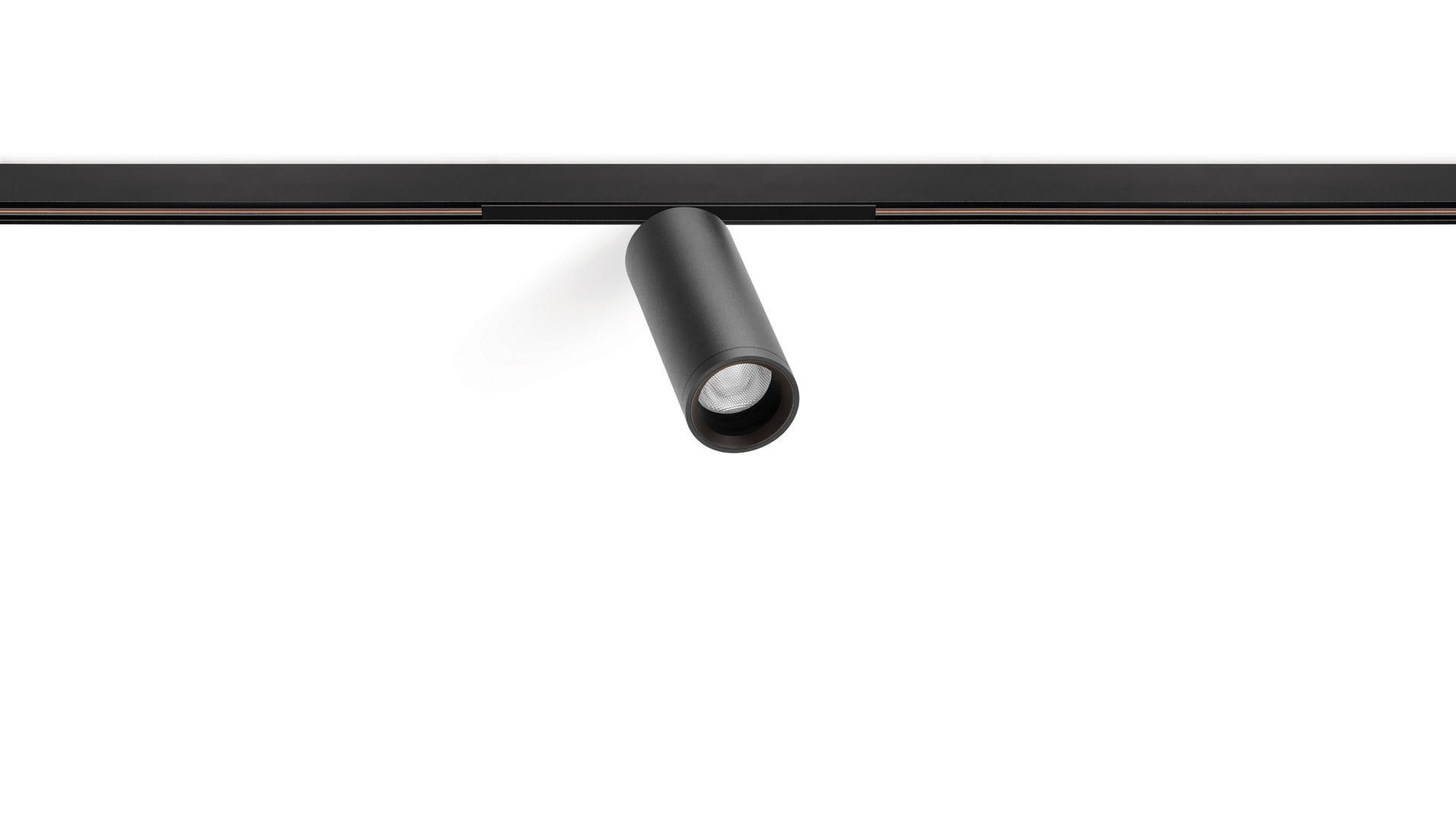 Géométrie cylindrique et de formes essentielles. Minimalisme esthétique et fonctionnalité. Projecteur pour applications de rails 48V.