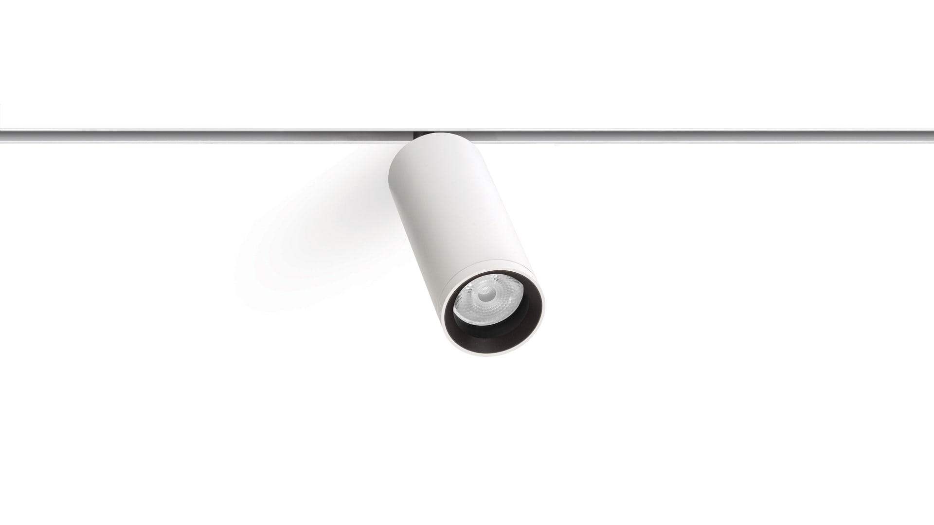Géométrie cylindrique et de formes essentielles. Minimalisme esthétique et fonctionnalité. Projecteur pour applications de rails 48V.
