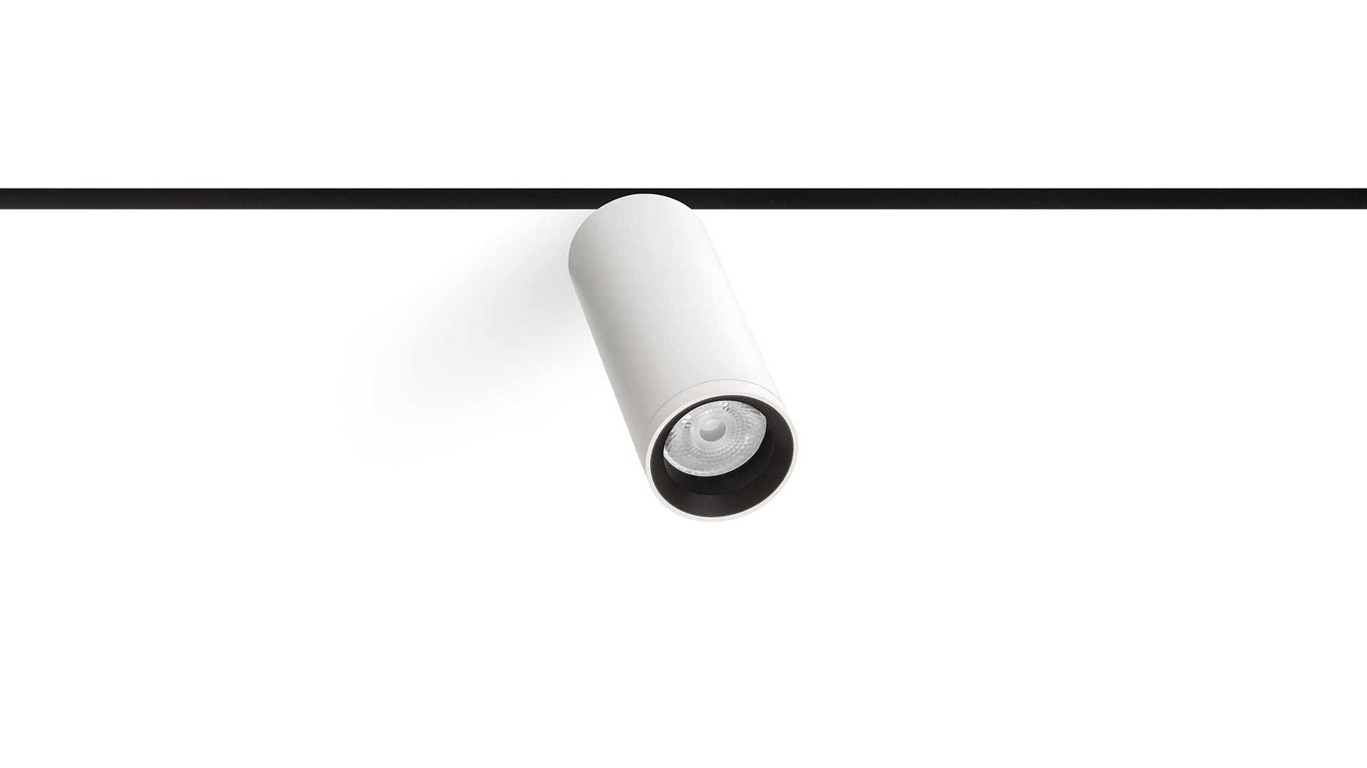 Géométrie cylindrique et de formes essentielles. Minimalisme esthétique et fonctionnalité. Projecteur pour applications de rails 48V.