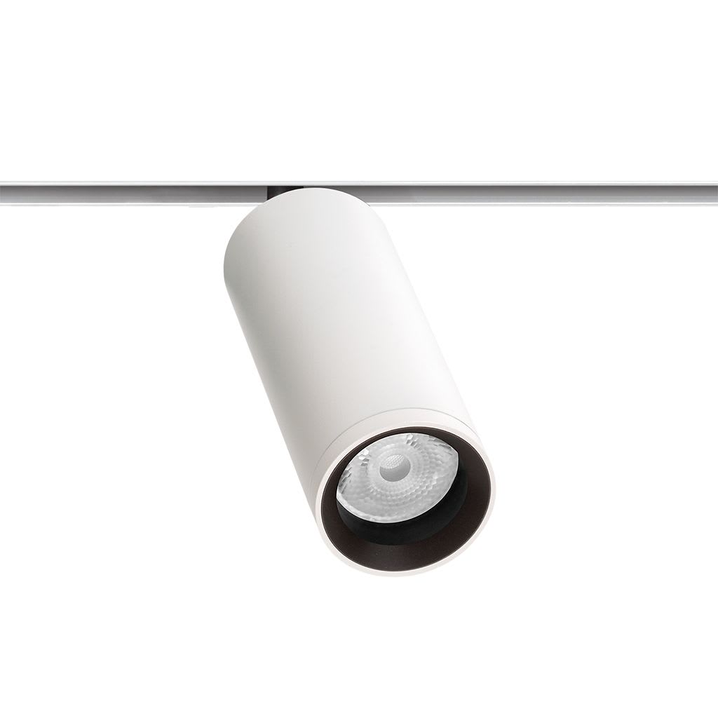 Géométrie cylindrique et de formes essentielles. Minimalisme esthétique et fonctionnalité. Projecteur pour applications de rails 48V.