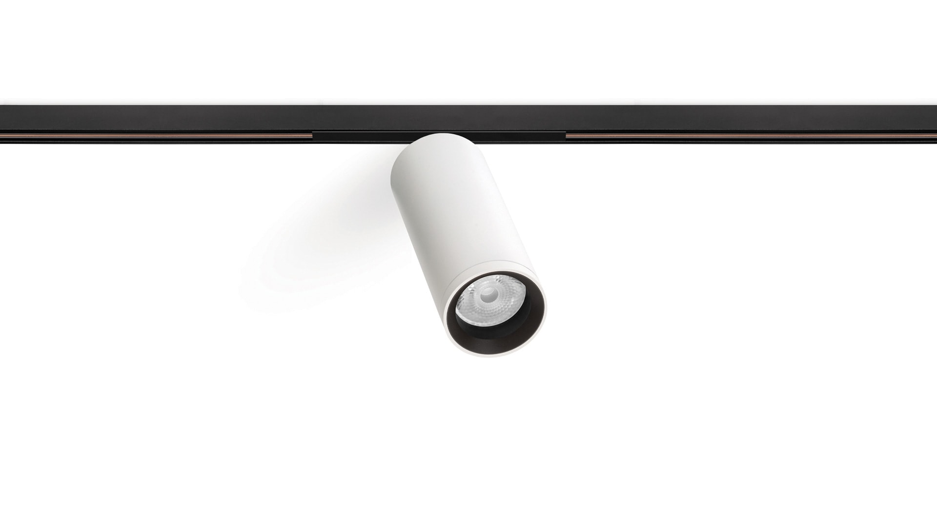Géométrie cylindrique et de formes essentielles. Minimalisme esthétique et fonctionnalité. Projecteur pour applications de rails 48V.