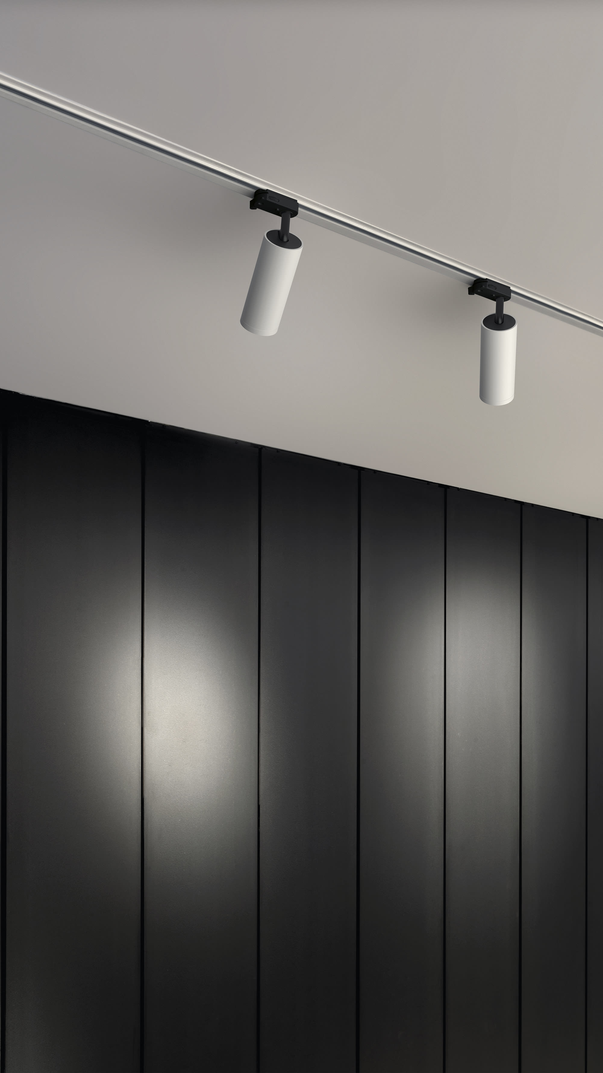 Géométrie cylindrique et de formes essentielles. Minimalisme esthétique et fonctionnalité. Projecteur pour applications de rails triphasées.