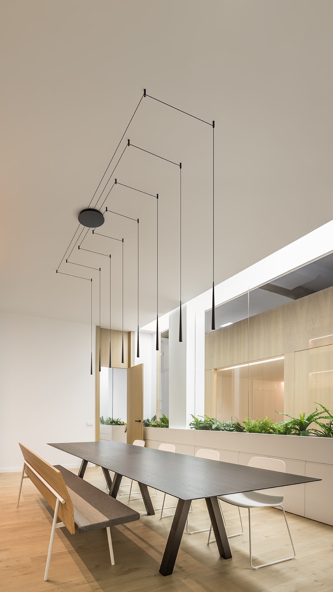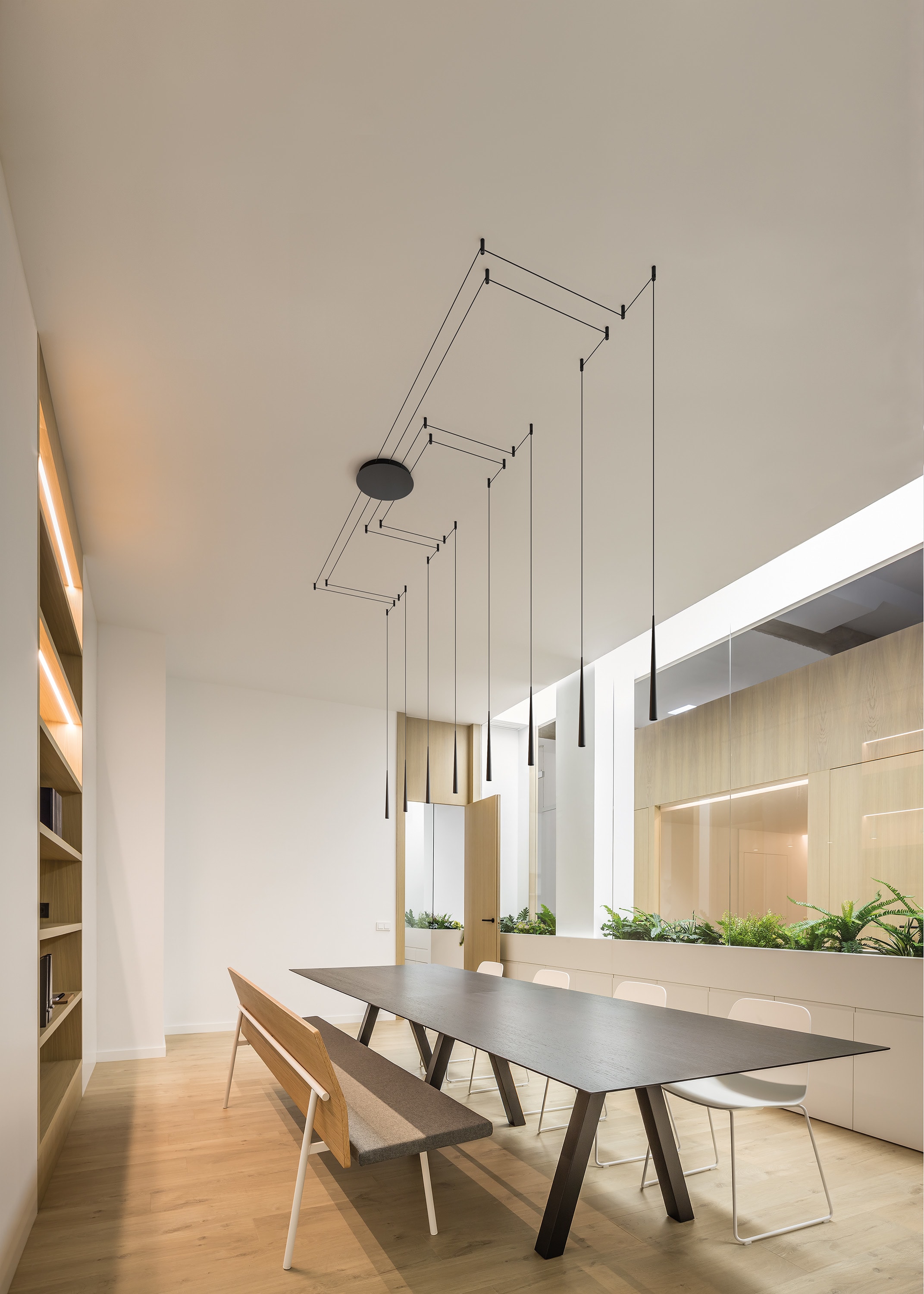 Base en trois tailles selon le nombre d’unités. Liberté totale pour concevoir avec les pistons la répartition lumineuse souhaitée des points d’éclairage. Système pour créer des compositions et des lignes avec des groupes de luminaires.