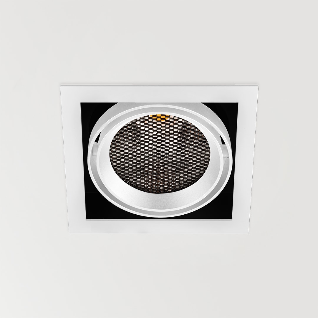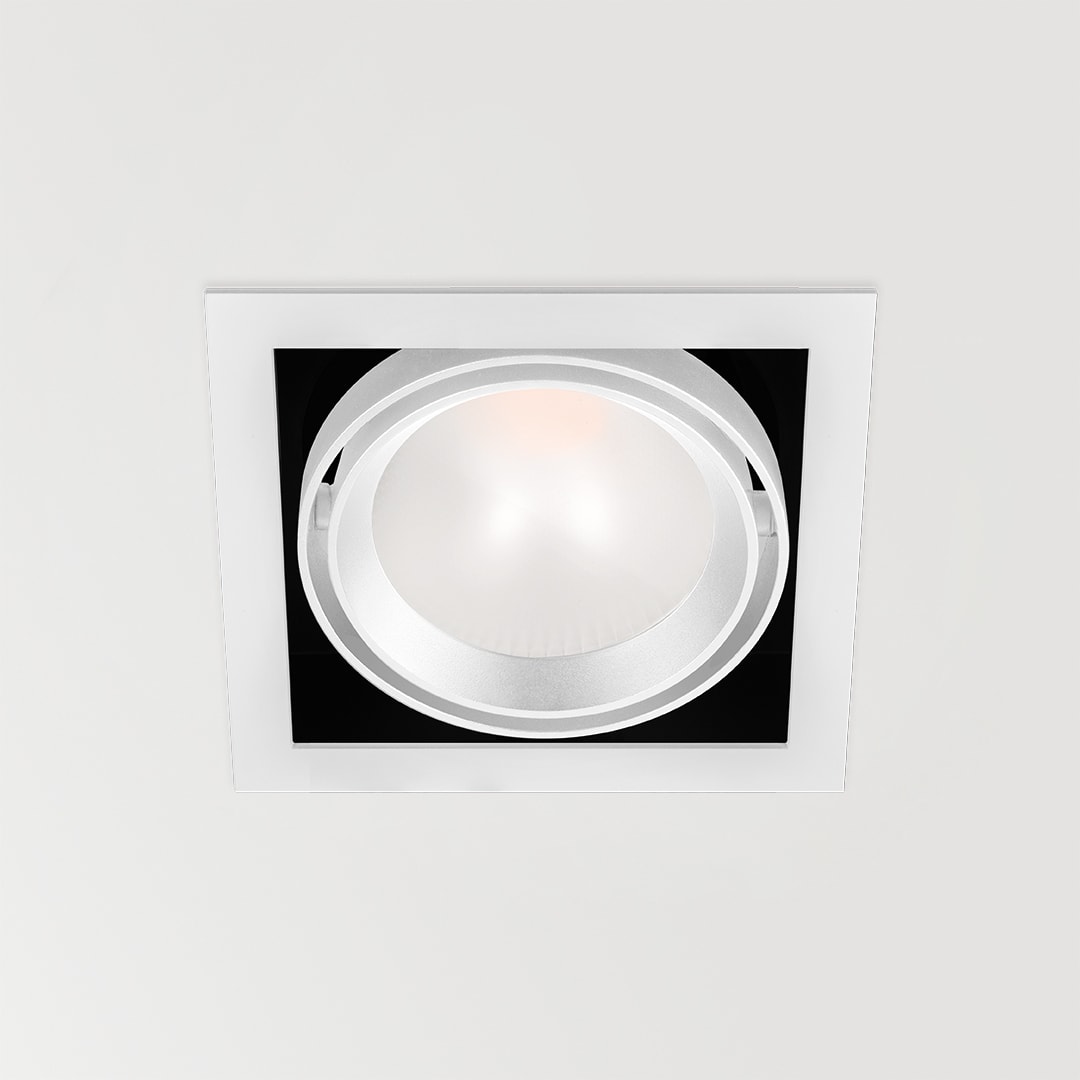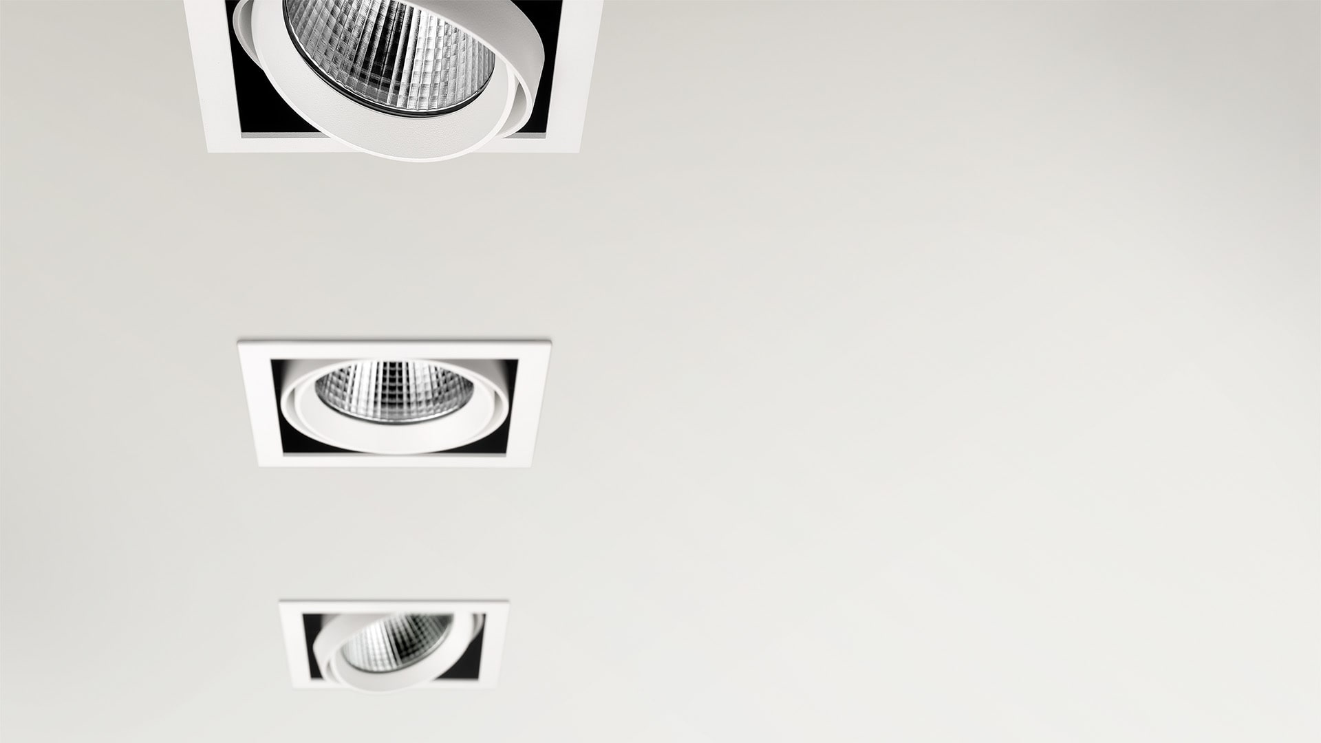 Flux lumineux remarquable, idéal pour des espaces qui ont besoin d’une grande quantité de lumière et d’un éclairage projeté. Luminaire à encastrer, à LED, basculant sur un système de cardan.